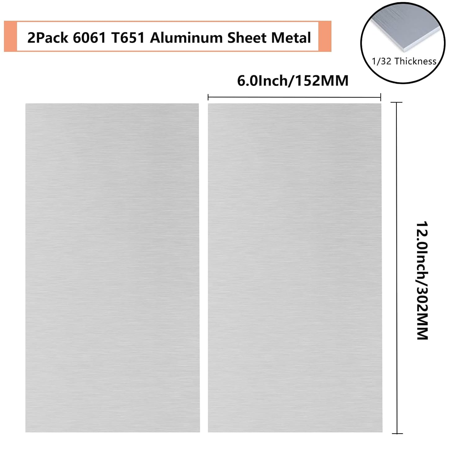 - 【6061-T651 Aluminum Sheet Size】2Pcs 6”(L)x12”(W)x 1/32” (0.8mm)(thick)