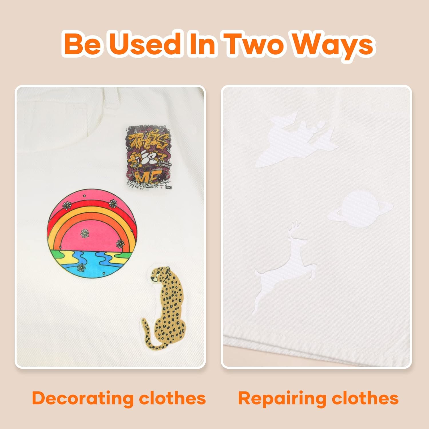 - 【No Residue & Bad Smell】Using a scissors to cut the size or shape you need to repair. Place the clothes patches on the garment with iron for heavy pressure or heat press for middle presure. Only few minutes will take for inside & outside reinforced. Simply reironed the corners to make the patches for clothes firm and no residue left