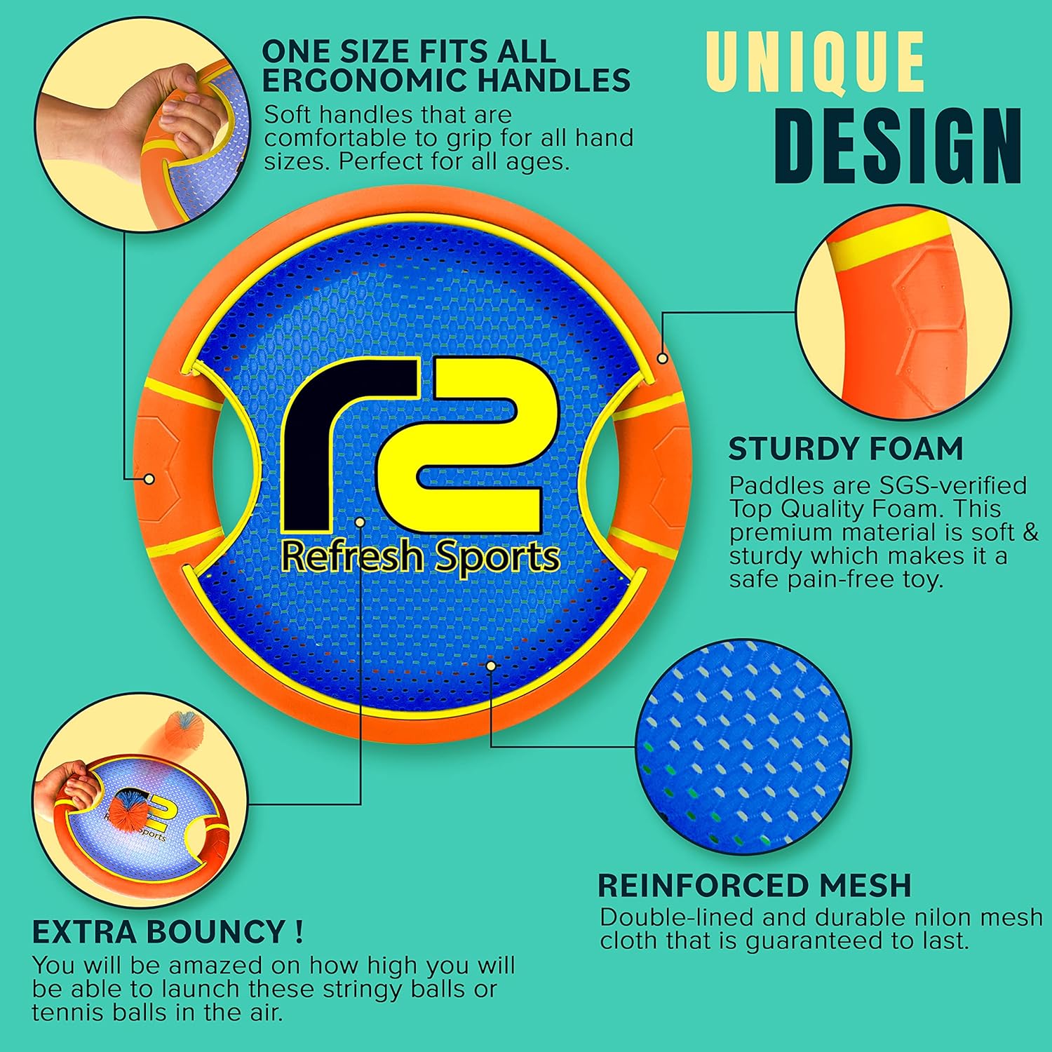 - π π¨ππ§ππ£ππ πππ ππ¦, π’π‘π π¦ππ§: Easy to pick up and play Badminton, Tennis, Baseball, and so much more! With the stringy balls and paddle's bouncy mesh, you can easily transition between games that would normally require separate equipment. You can even swap the rubber balls for water balloons on hot summer days for some extra splashy fun!