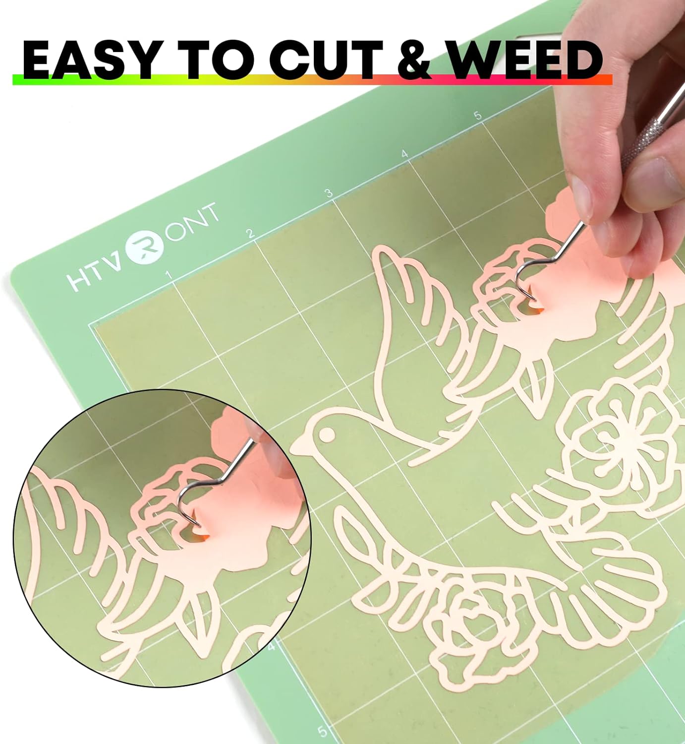 - 【EASY TO CUT WEED TRANSFER】Our premium quality heat transfer vinyl will save time which you may waste on each image or letter, because you can cut and weed easily through the designs just right. The iron on vinyl is sensitive to temperature and pressure, which can be heat transferred to any t-shirt easily. Before cutting, make sure the blade is clean and sharp, so that your design can be cut well and weeding can be done better