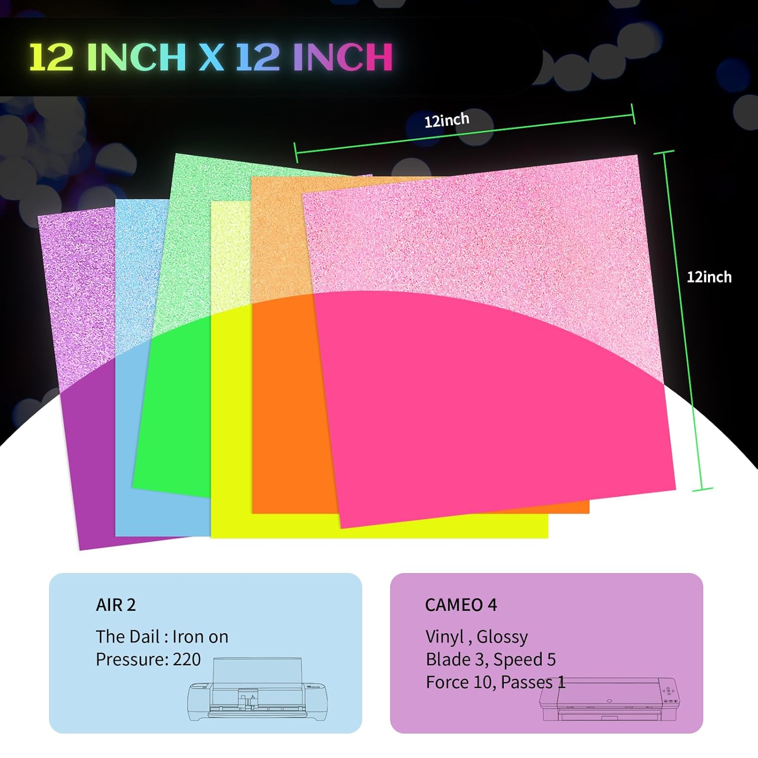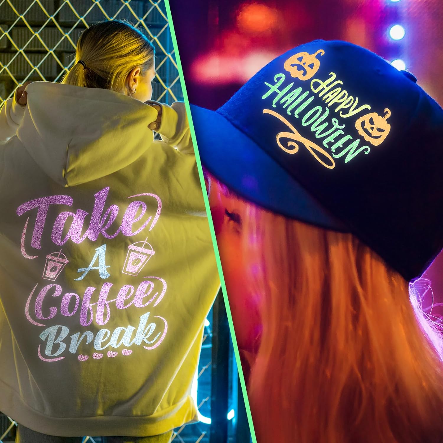 - Reflective HTV Vinyl Sheets: This is a assorted color Neon PU heat transfer vinyl pack, the difference is that at night or in the dark, 6 fluorescent colors Vinyl will reflect 7 different colors when exposed to bright light in the dark. Its carrier is high-quality high-temperature, non-deformable PET material with a slight viscosity, which has excellent cutting and weeding functions.