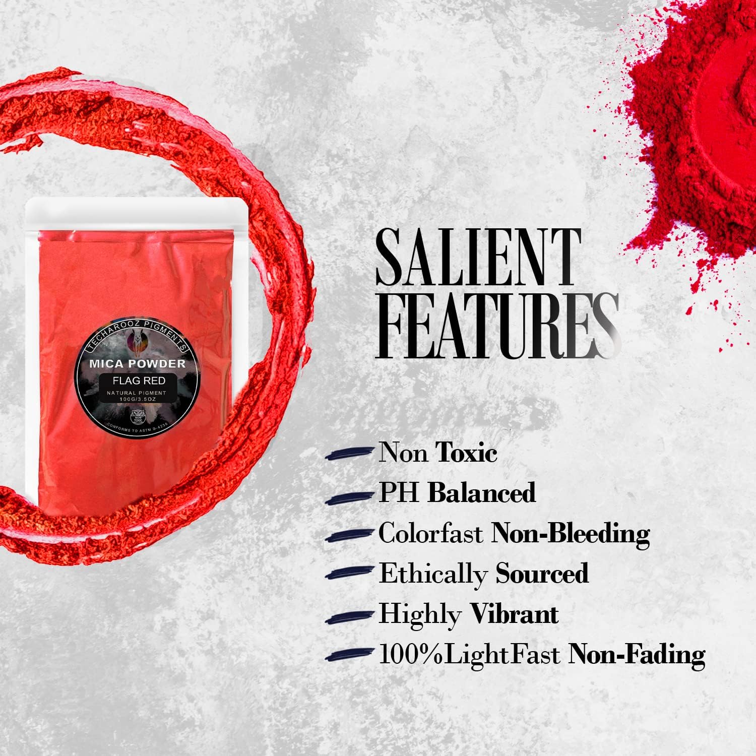 - Large Bag: Premium quality Red Flag mica powder in a large 100g/3.5oz bag. Perfect quantity and quality for craft projects of any size. This individually packed mica-based colorant is highly pigmented and will last a long time. Mix it with any TECHAROOZ colors to create unlimited combinations of different hues