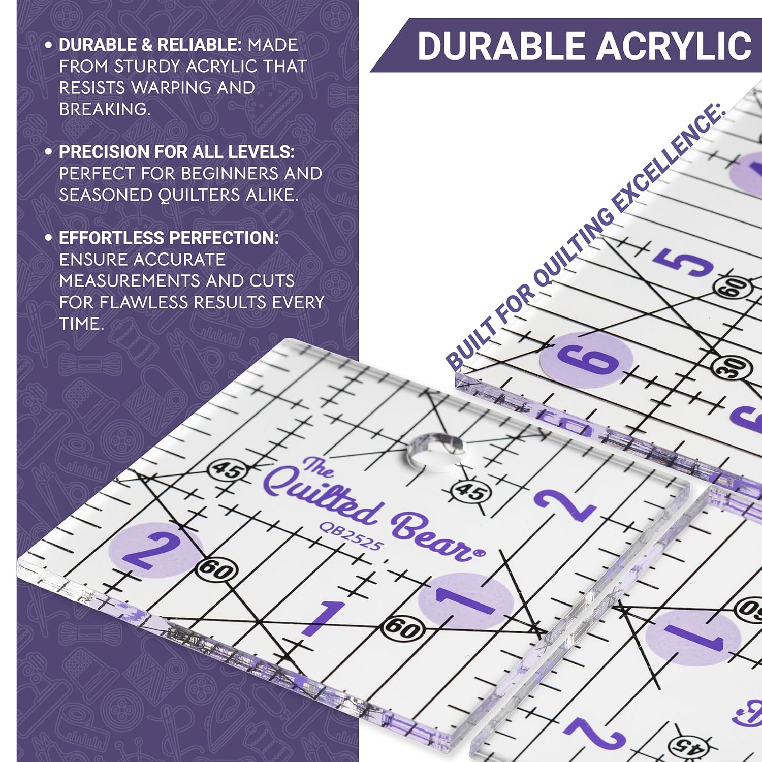 - Durable Acrylic Design: A clear ruler made from 3mm-thick Acrylic. This quilting ruler withstands heavy use and works seamlessly with rotary cutters and quilting supplies.