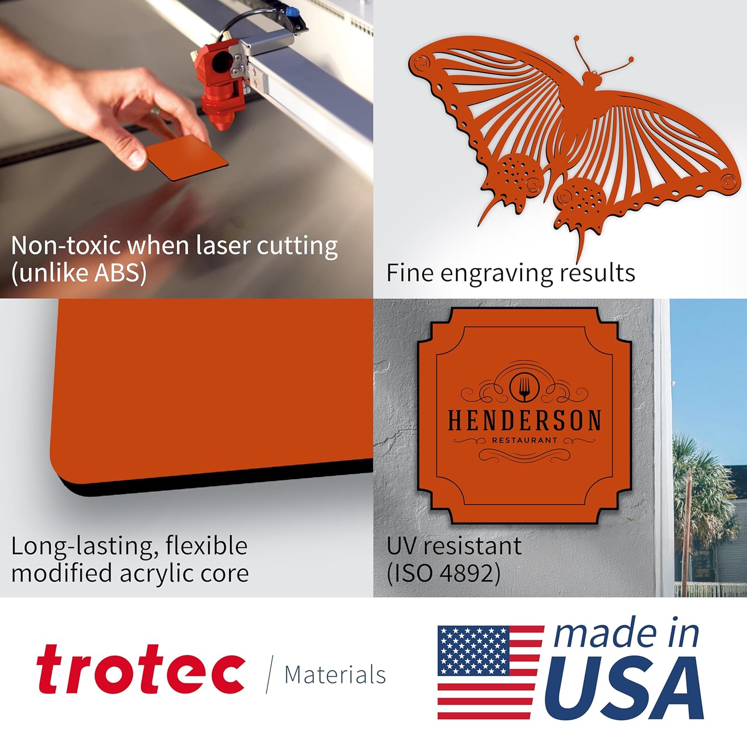 Trotec TroLase | 12"x12"x1/16", 8 Pcs | Orange/Black | 2 Ply | Modified Acrylic | Laser Engraving Double Color Plastic Sheet | Engraving Blanks for Laser, Saw, Guillotine | Made in USA