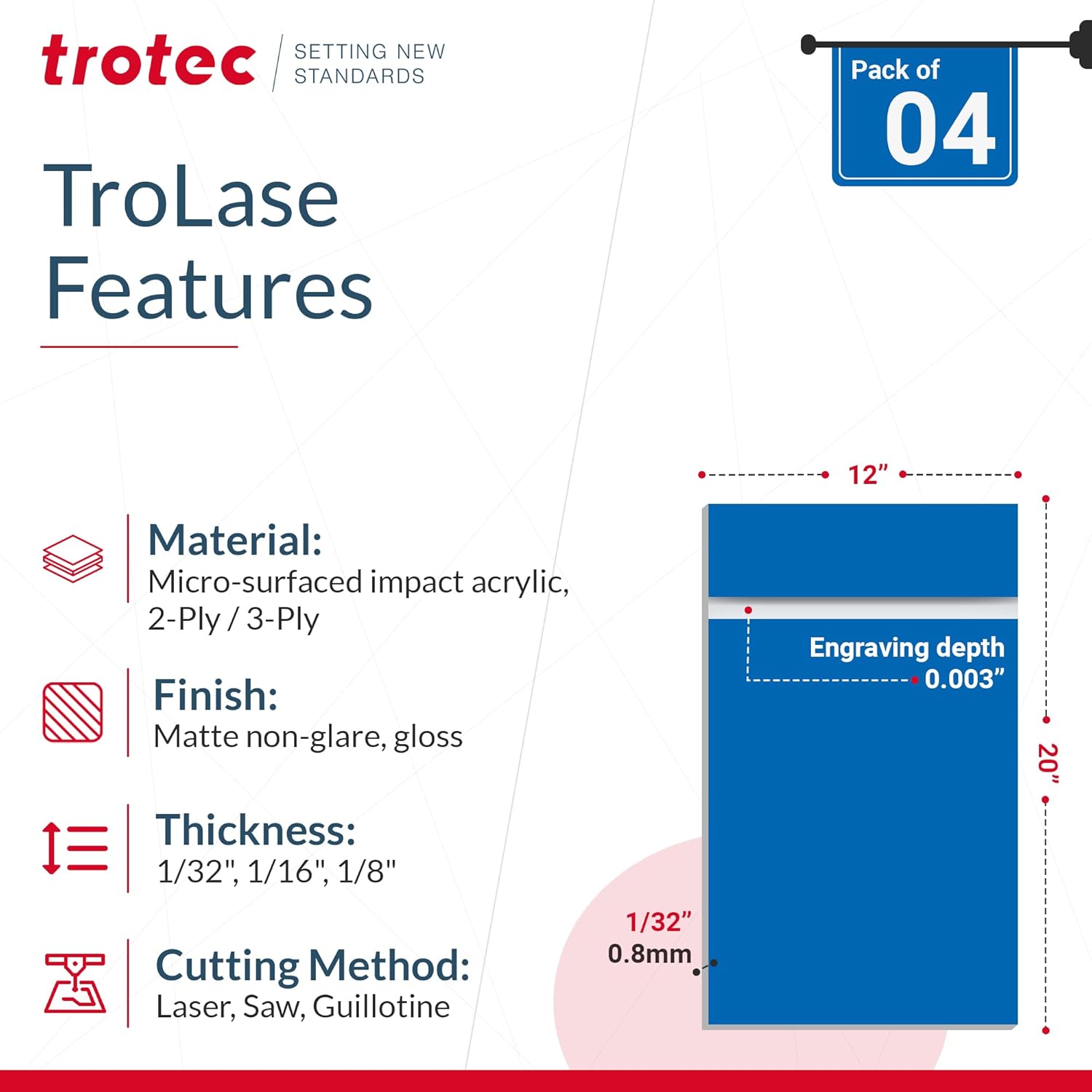 Trotec TroLase | 12"x20"x1/8", 4 Pcs | White/Black | 2 Ply | Modified Acrylic | Laser Engraving Double Color Plastic Sheet | Engraving Blanks for Laser, Saw, Guillotine | Made in USA