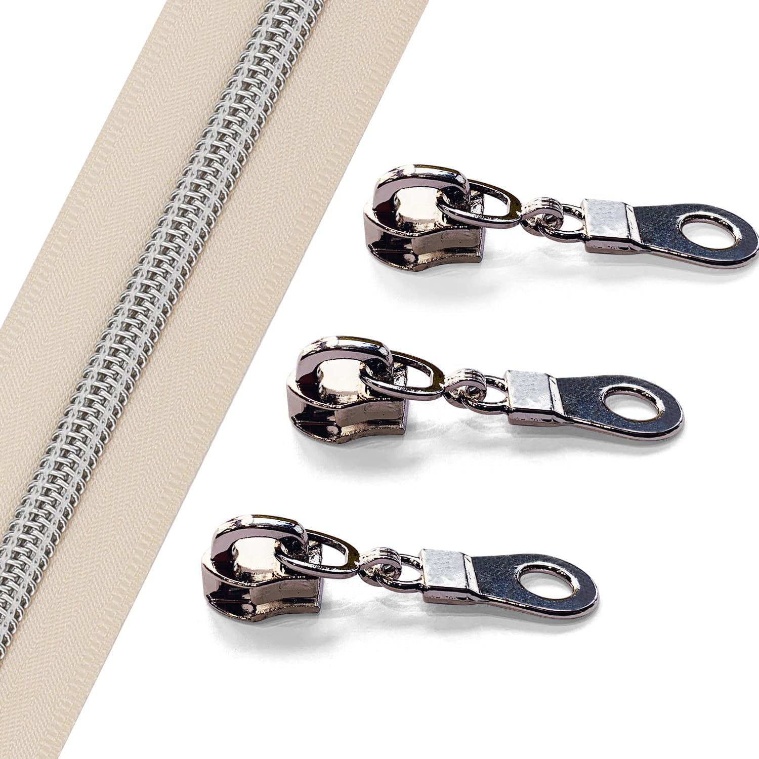 Sawoake 10 Yards Bulk Zipper(#5), Beige Nylon Coil Zipper with Silver Teeth by The Yards, Replacement Sewing Zipper with 10PCS Zipper Sliders for DIY Sewing Craft Bags(#5 Silver Beige)