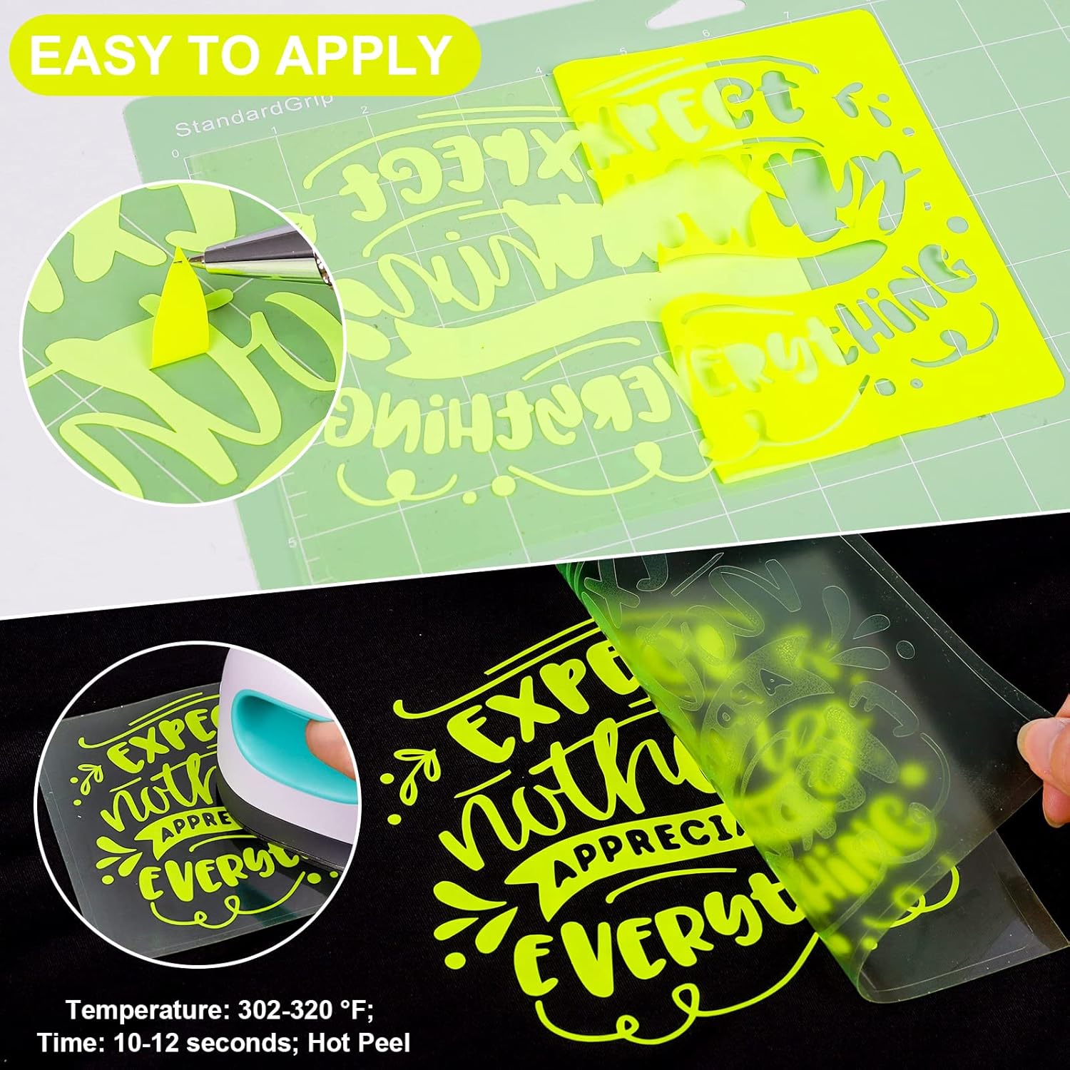 - ✂️EASY TO APPLY: Just use craft cutter and a home iron to get the job done. Apply for approximately 10-12 seconds at 302-320 °F (150-160 °C) and about 10 LBS of pressure. Be sure to cold peel.