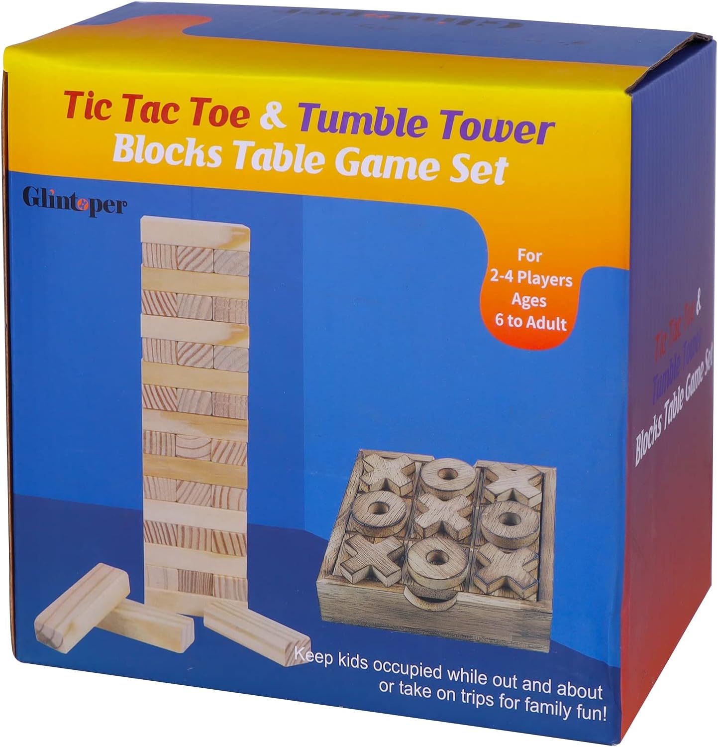 - High Quality: Crafted from safe and non-toxic, top quality wooden material, smooth surface, neatly cut, without sharp edges. Boards are made from natural wood, Featuring solid blond wood, better and safer than other brands. Tic Tac Toe 5 X and 4 O are included. Tumble Tower comes with 54 pieces wooden tumble blocks