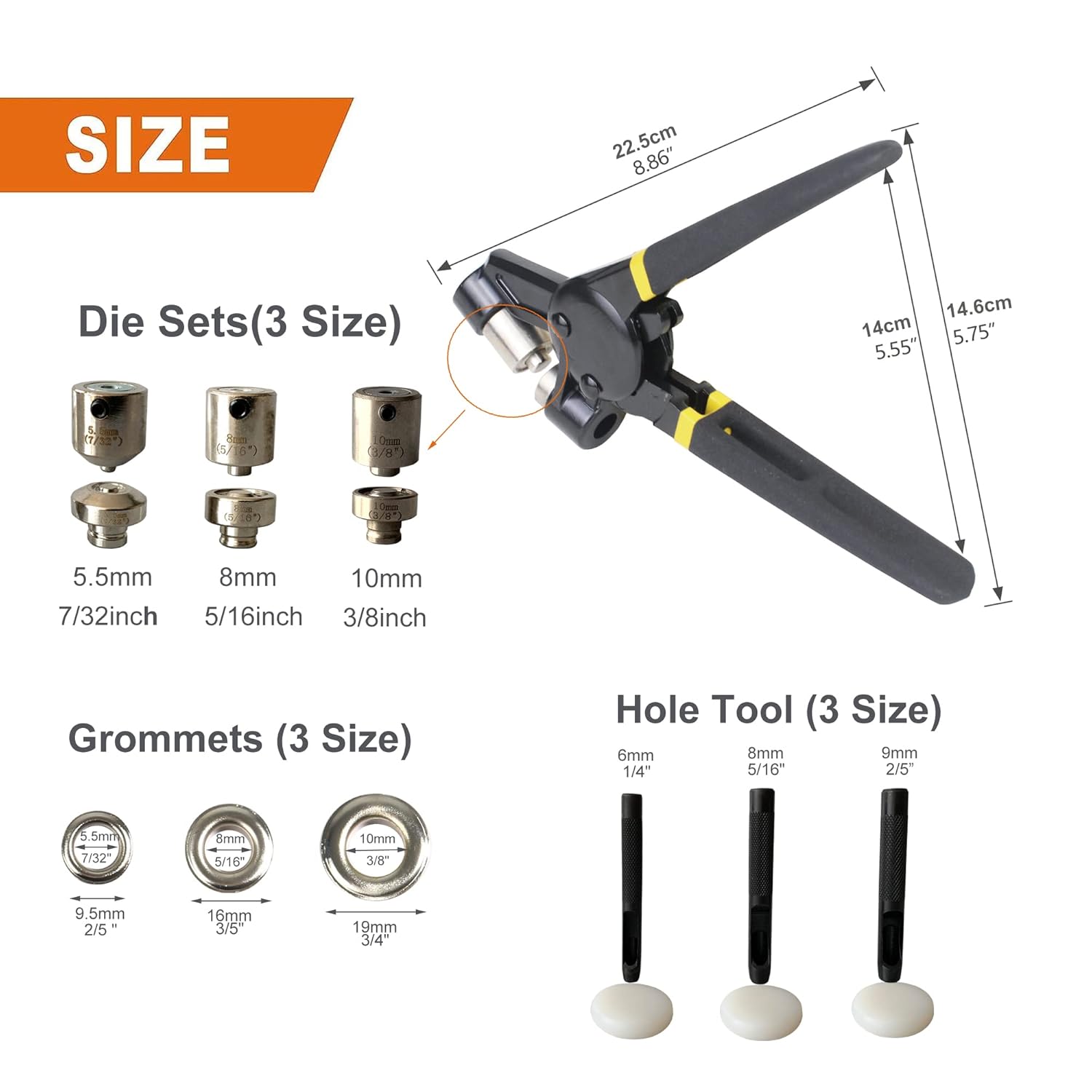 - Multi size Interchangeable Design: This grommet tool kit features a multi-functional design with interchangeable dies of 5.5mm, 8mm, and 10mm, accommodating three different sizes of grommets. One grommet tool effectively serves the purpose of three grommet tool , catering to varied requirements with ease.