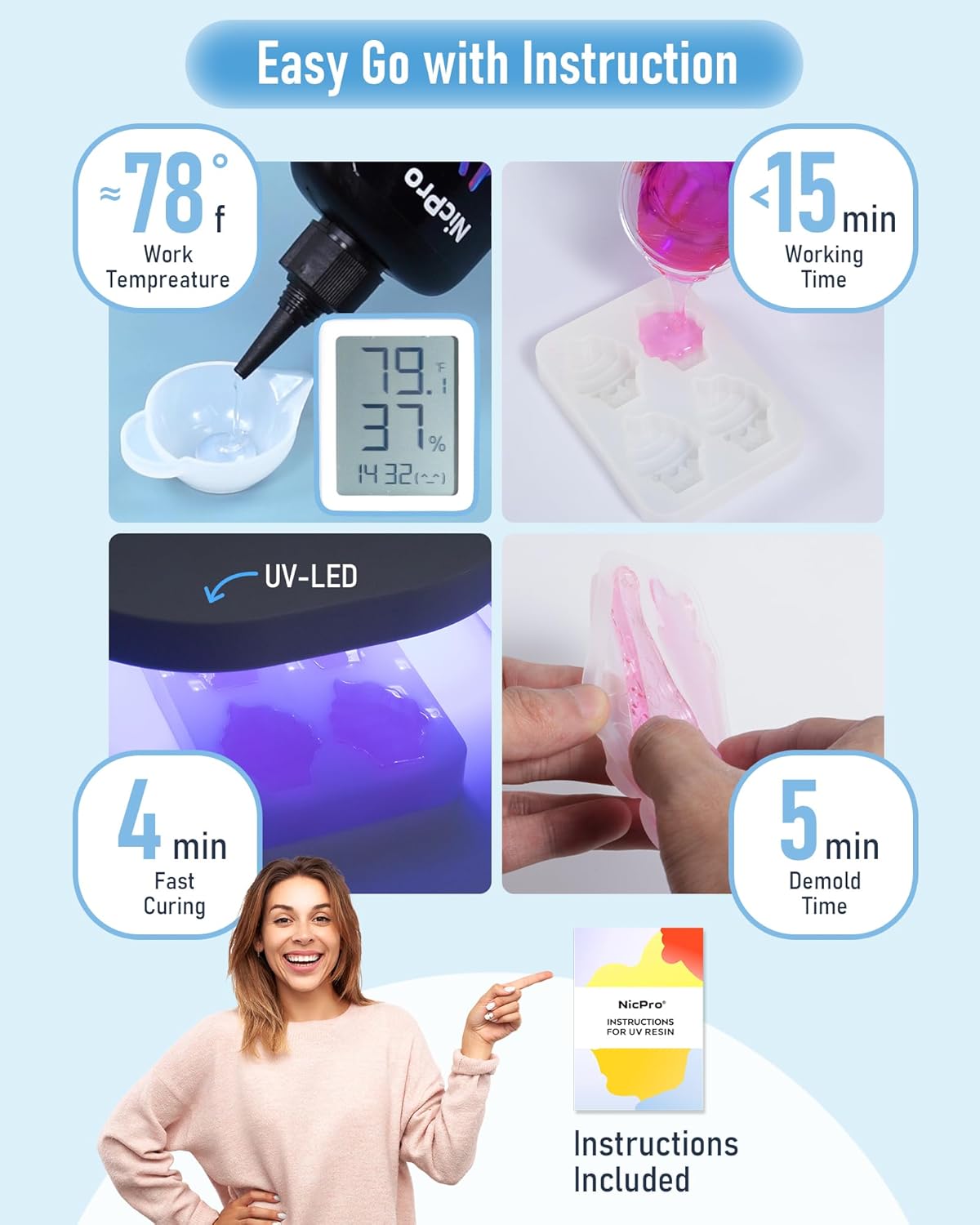 - Low Odor and Safe To Use:Nicpro upgrade UV resin is developed and produced safely after long testing and improvement. Made of high quality materials, the ingredients of our UV resin glue have been strictly checked, and has safety certification. Low odor, non-toxic and shrinkage rate lower than 2%, harmless to you and the environment