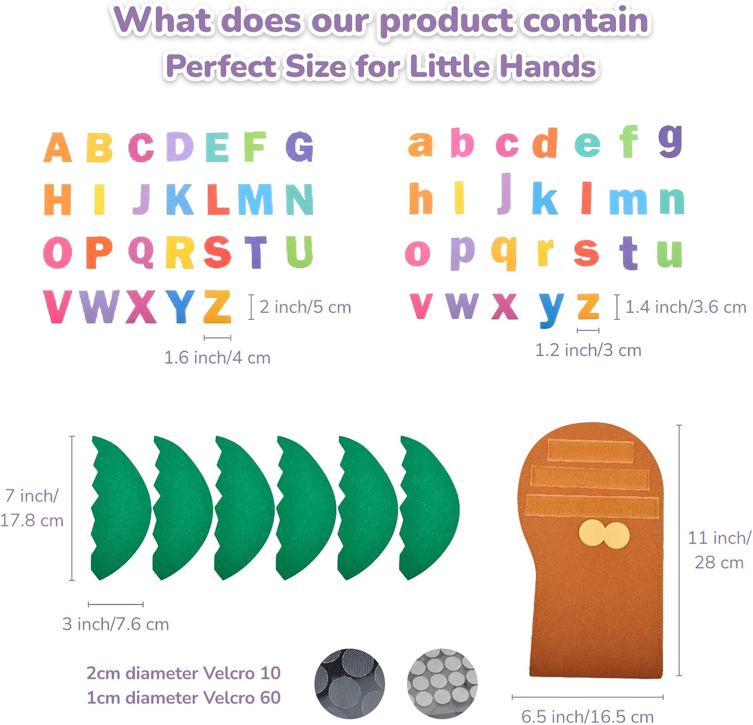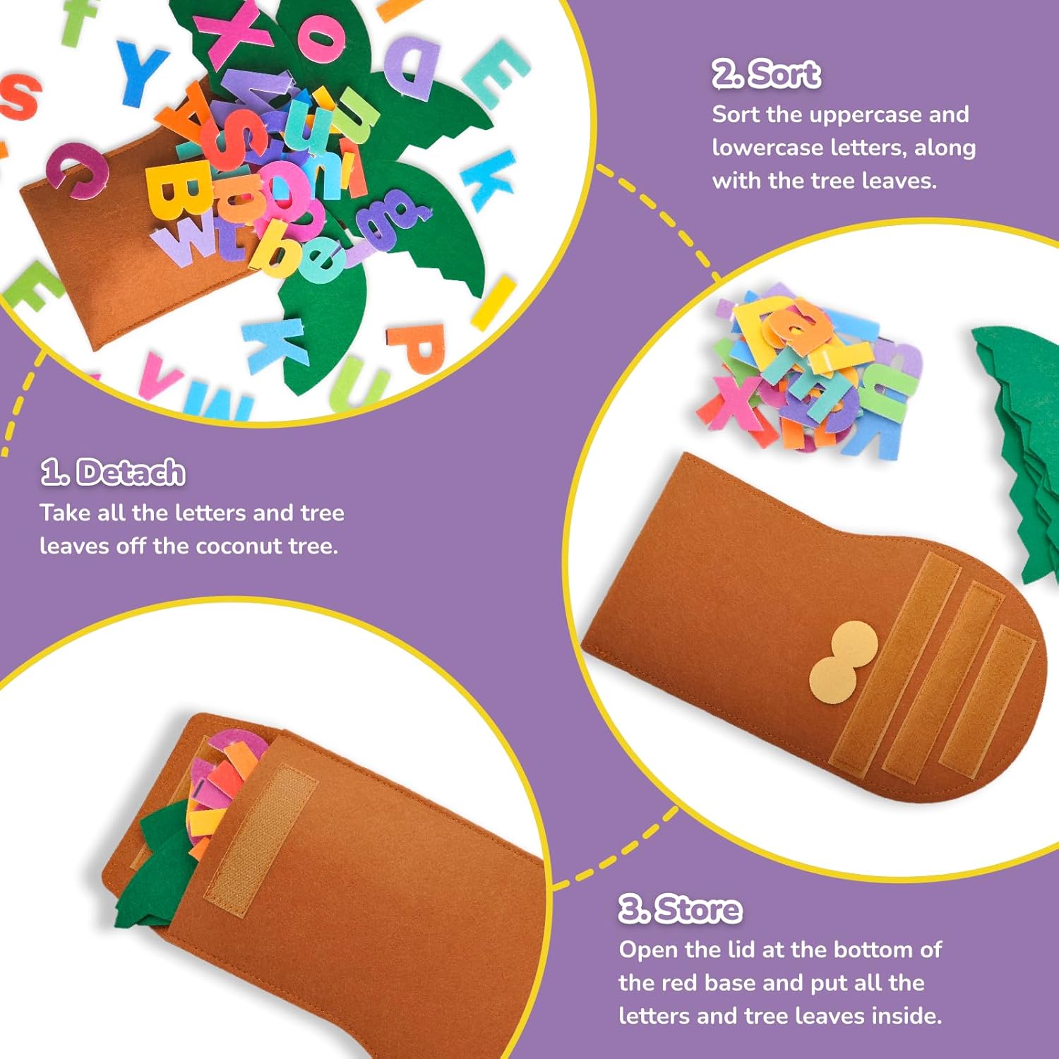 - PACKAGE INCLUDES- 1 Hand puppet style felt Coconut Tree with the size of 12 inches high, 26 uppercase and 26 lowercase felt letters that adhere to it with hook and loop tabs