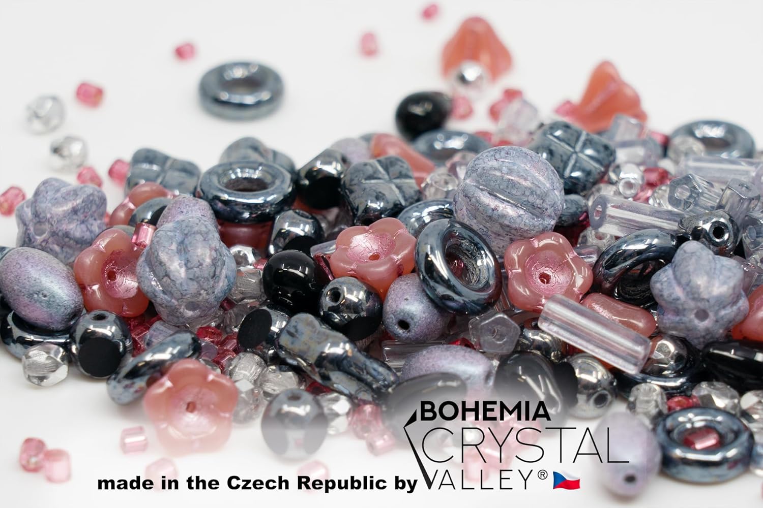 2.1oz (60 g) Mix of Unique Czech Bohemia Glass Pressed Beads, Matte and Glossy, Hand Made, Pink Gray Black Hematite