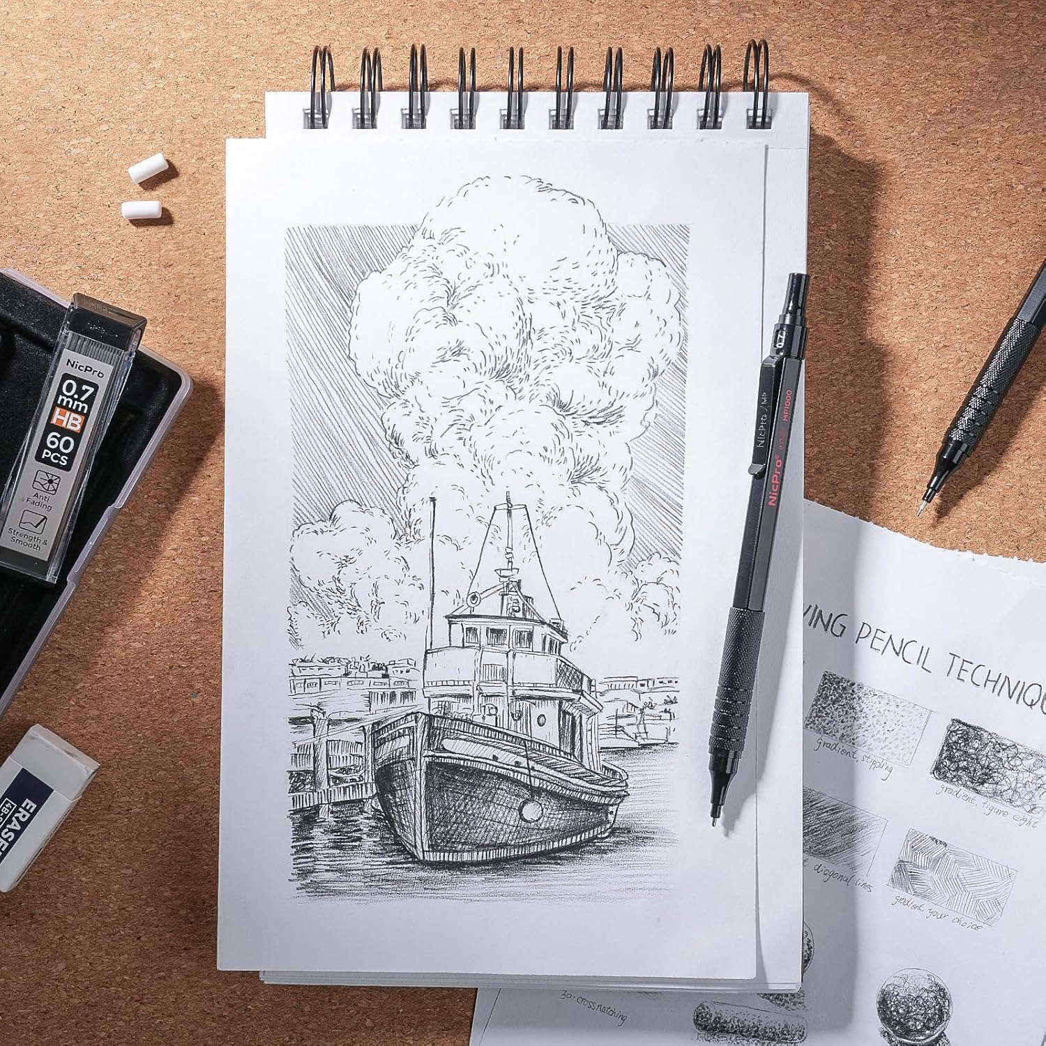 Nicpro Black Art Mechanical Pencil Set, 5PCS Metal Drafting Pencils 0.3, 0.5, 0.7, 0.9 mm & 2mm Graphite Lead Holder For Sketching Drawing With 9 Tubes (4B 2B HB 2H Colors) Lead Refills Erasers Case