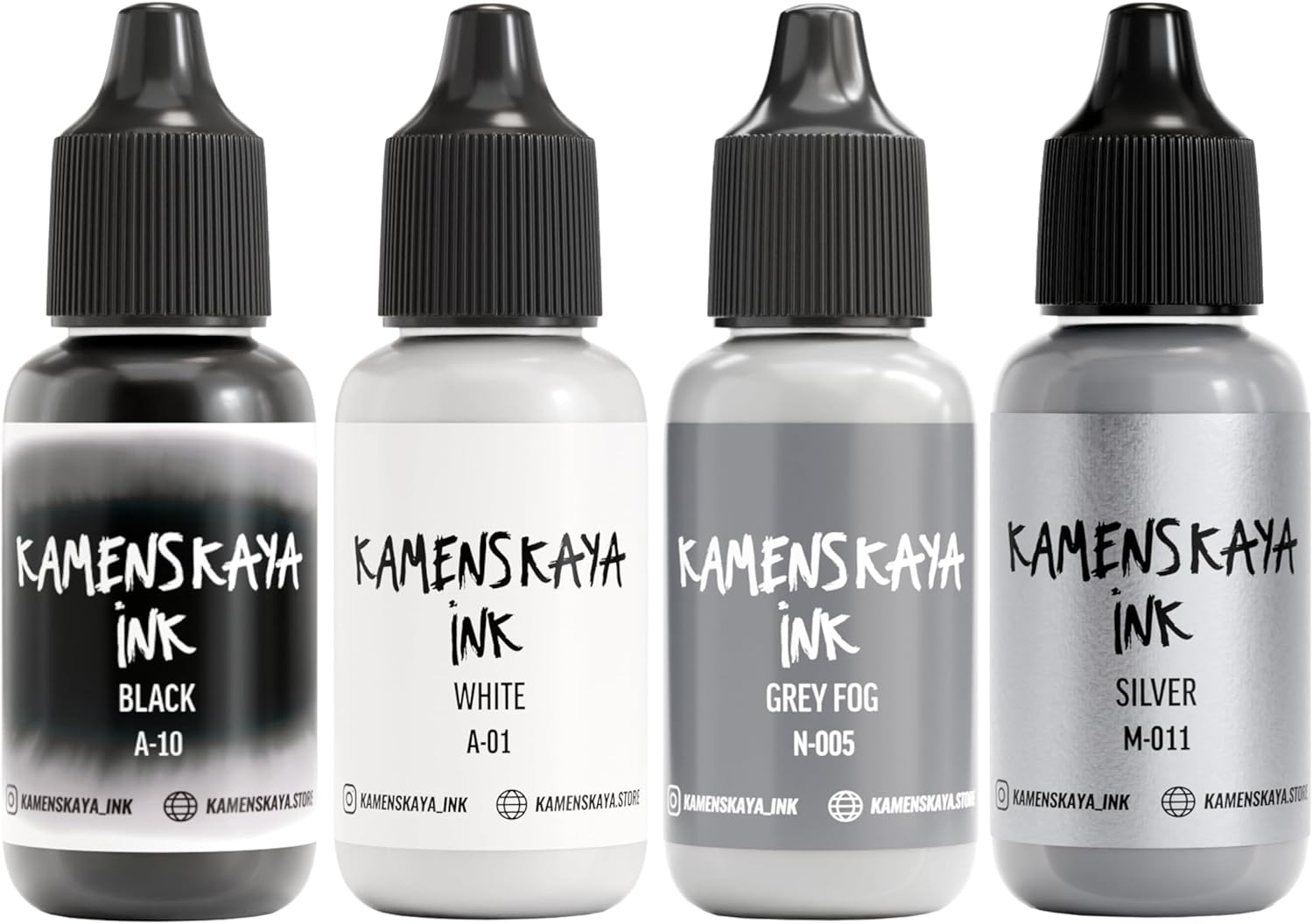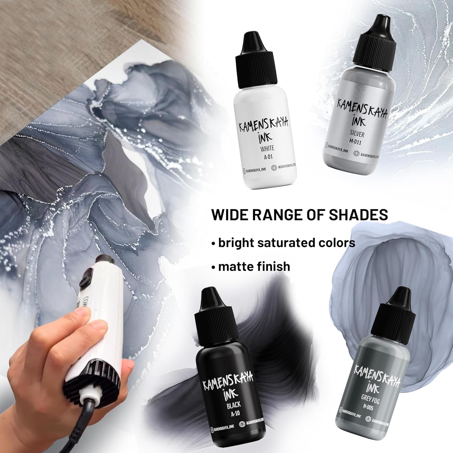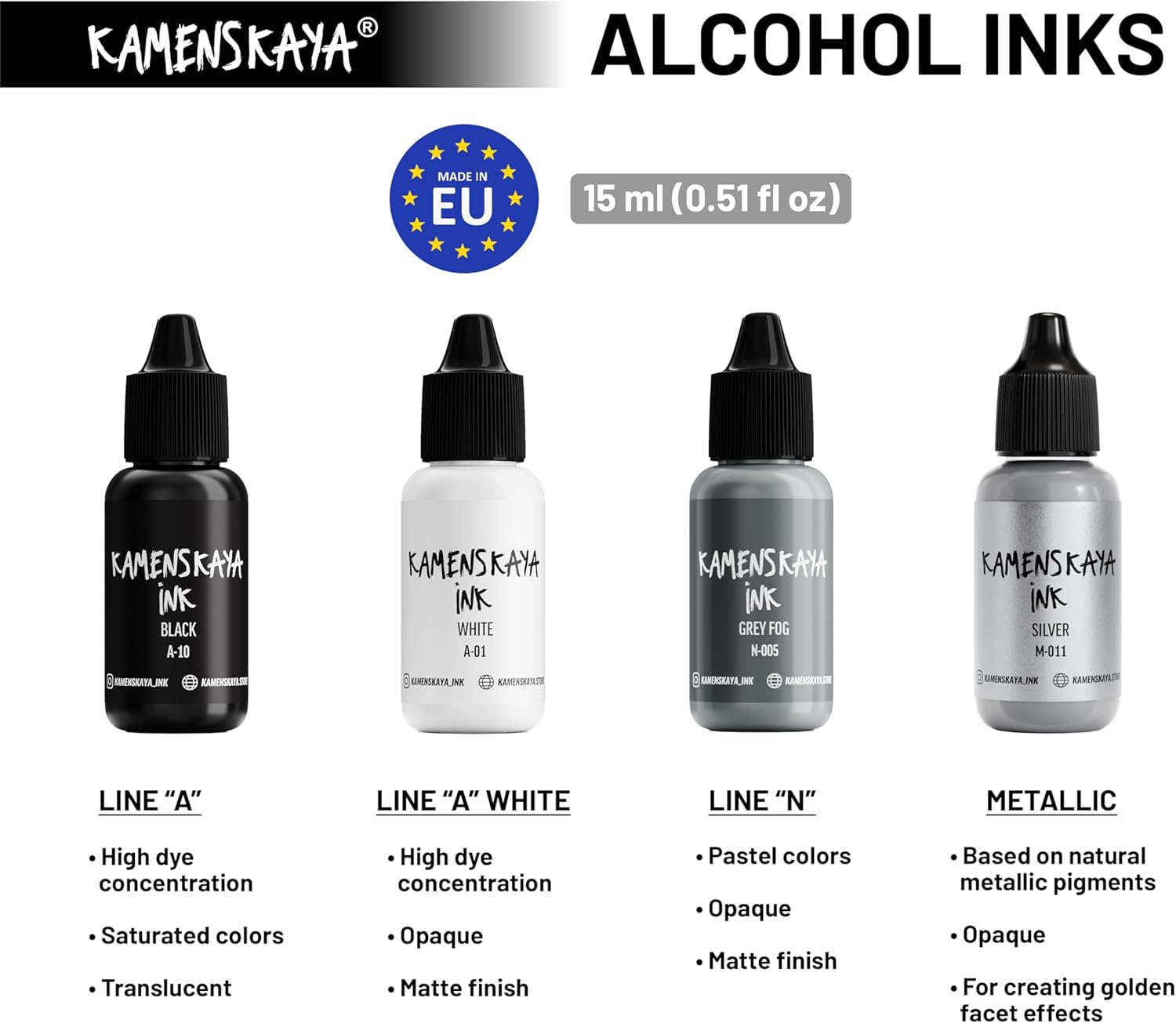 - Set composition: 4 inks 0.51 fl oz (15 ml) each. 2 inks of basic βAβ line (light translucent texture, saturated color and a nice satin finish), 1 metallic alcohol ink (natural metallic pigment ink to create golden facets and light cobwebs in your ink art work) and 1 pastel alcohol ink (delicate pastel shade with velvety finish based on dye and pigment, where the pigment provides a dense and opaque layer, while the dye is responsible for the color)
