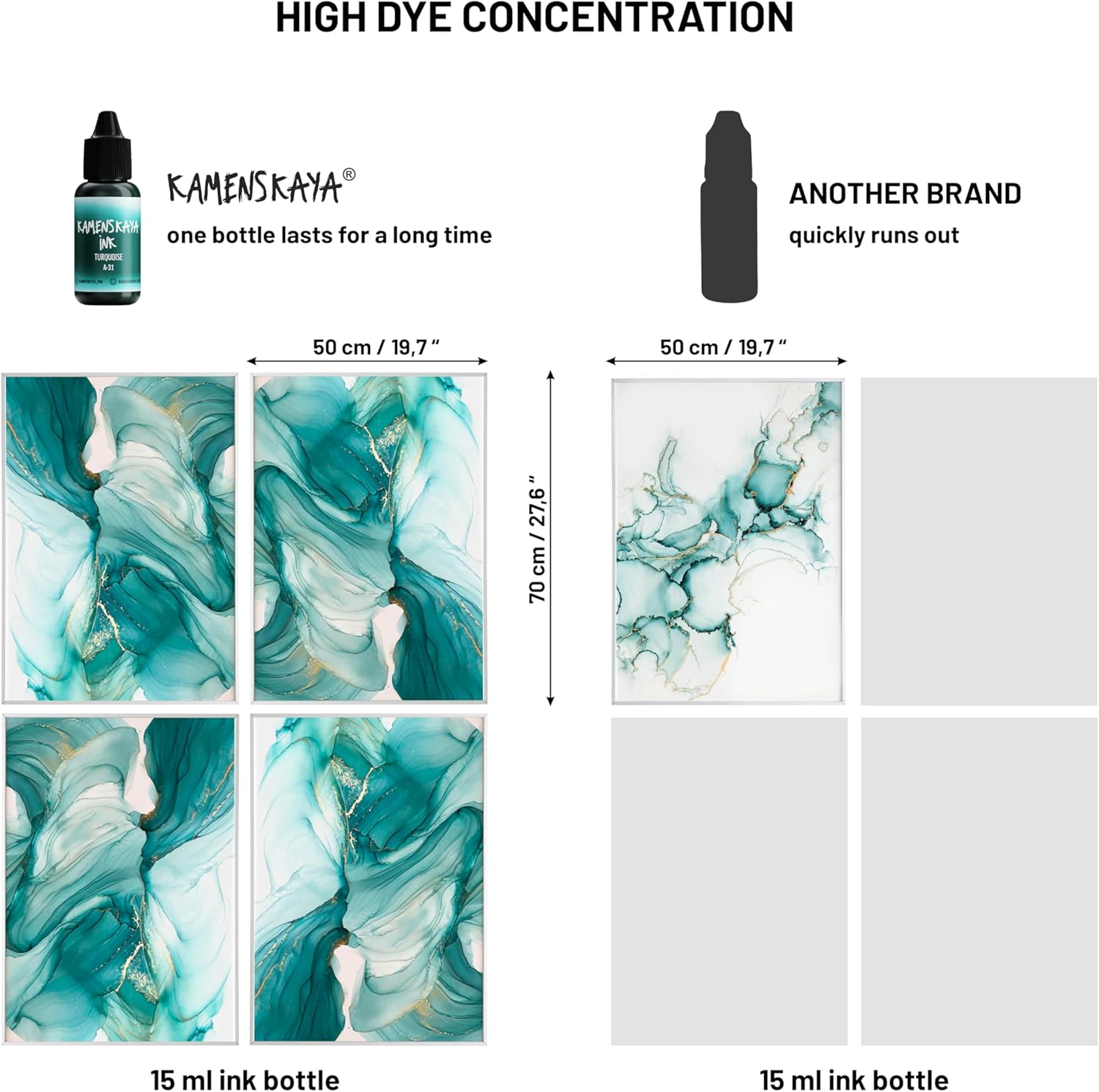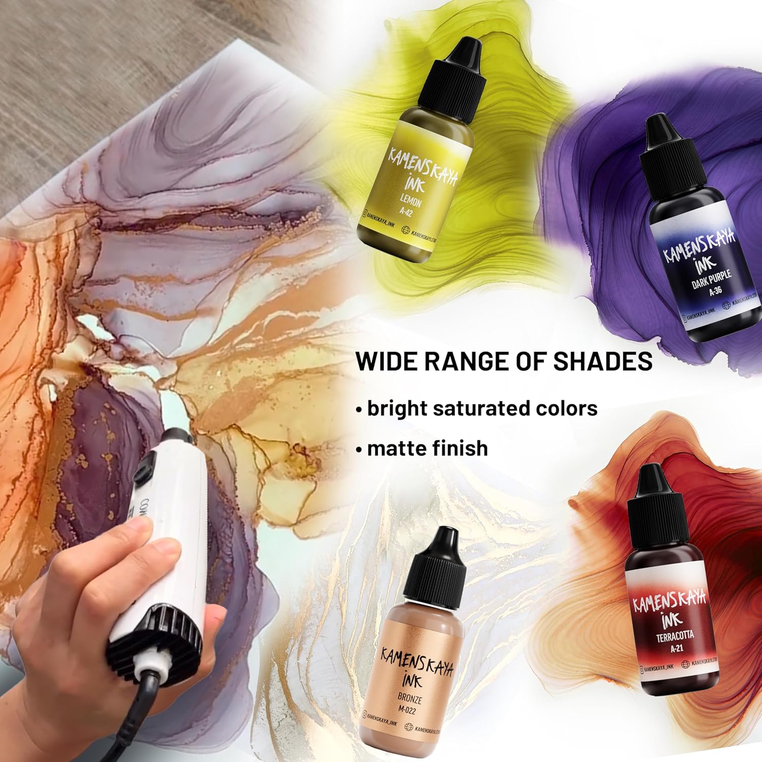 - Set composition: 4 inks 0.51 fl oz (15 ml) each. 3 inks of basic ‘A’ line (light translucent texture, saturated color and a nice satin finish), 1 metallic alcohol ink (natural metallic pigment ink to create golden facets and light cobwebs in your ink art work)