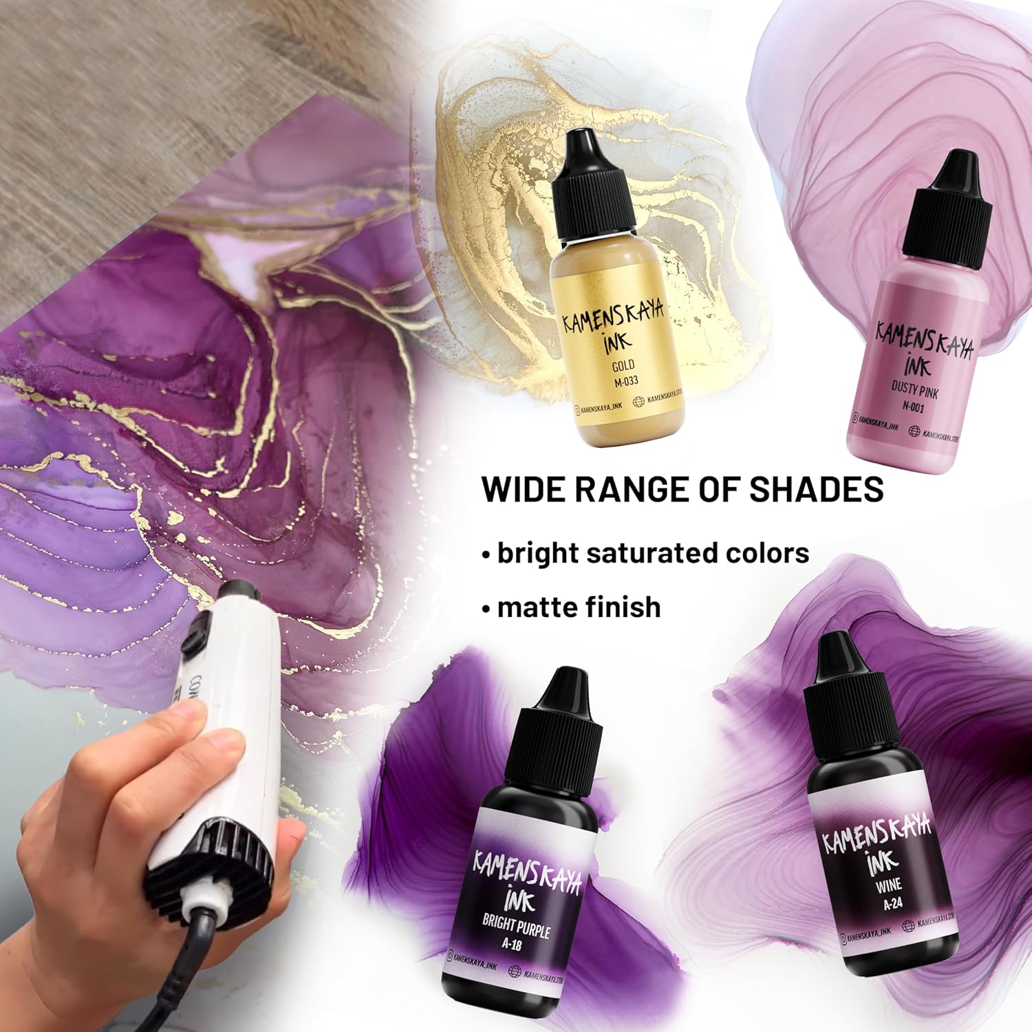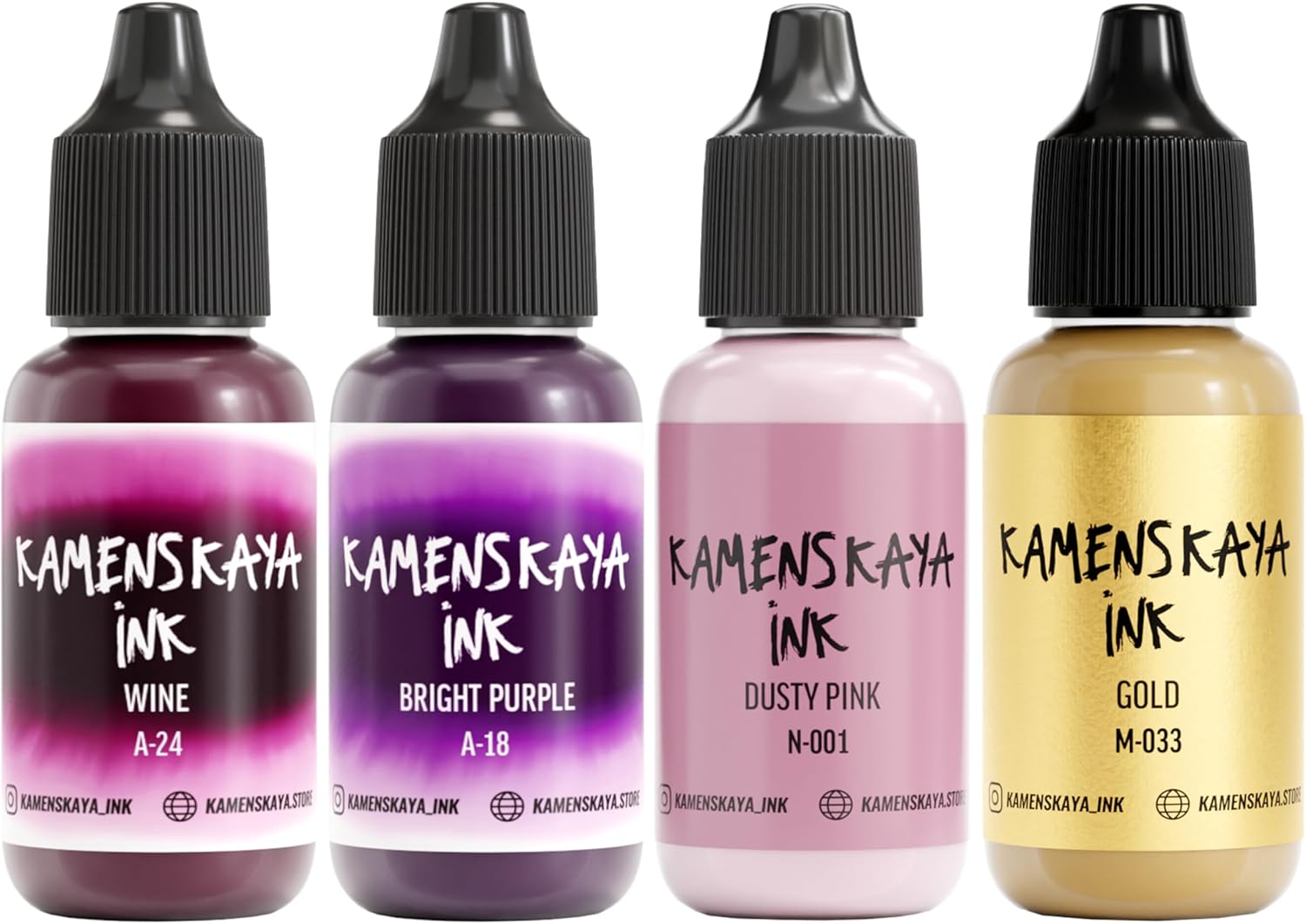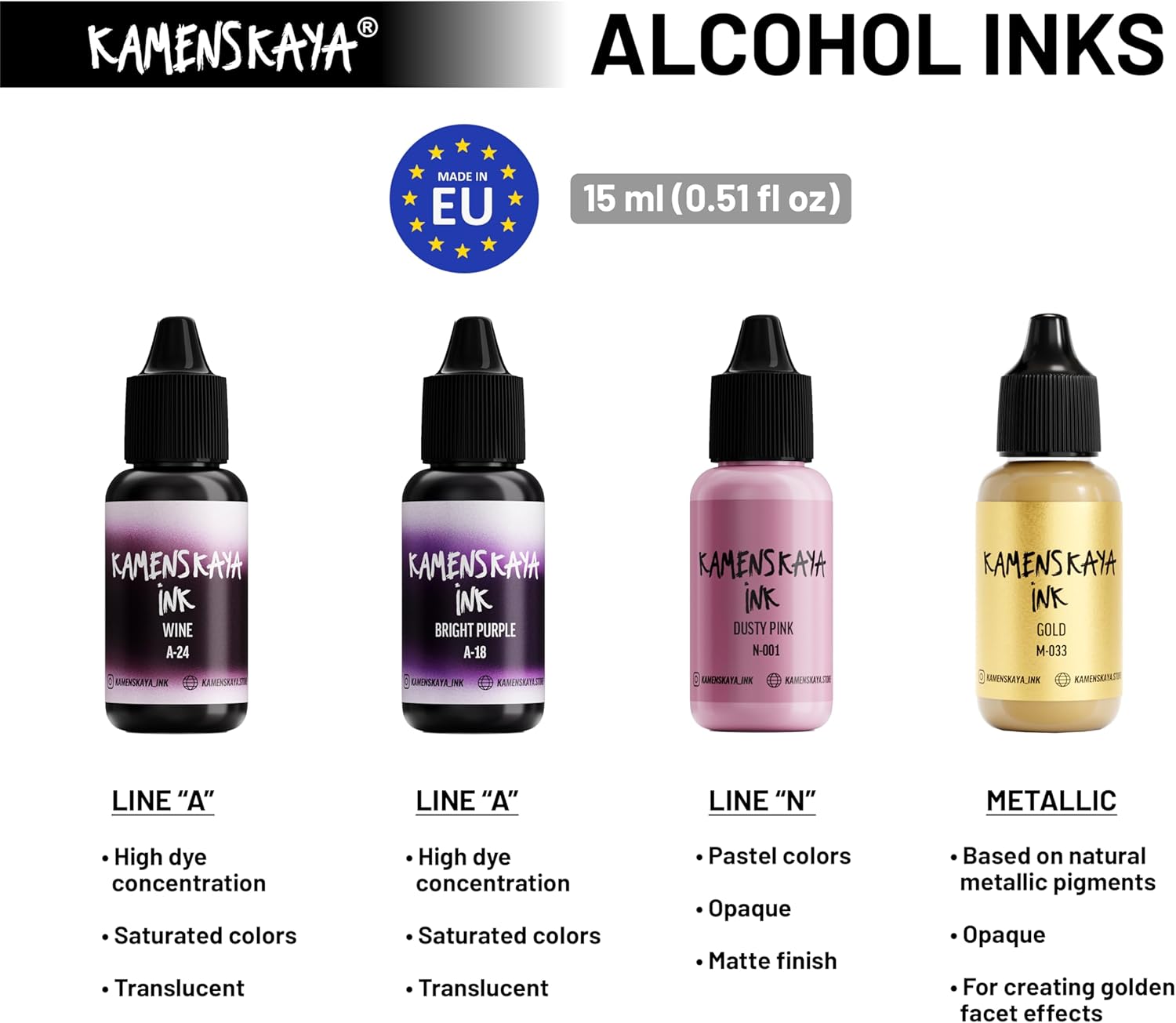 - Set composition: 4 inks 0.51 fl oz (15 ml) each. 2 inks of basic ‘A’ line (light translucent texture, saturated color and a nice satin finish), 1 metallic alcohol ink (natural metallic pigment ink to create golden facets and light cobwebs in your ink art work) and 1 pastel alcohol ink (delicate pastel shade with velvety finish based on dye and pigment, where the pigment provides a dense and opaque layer, while the dye is responsible for the color)