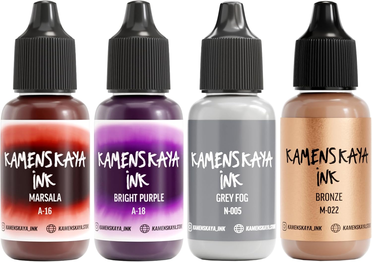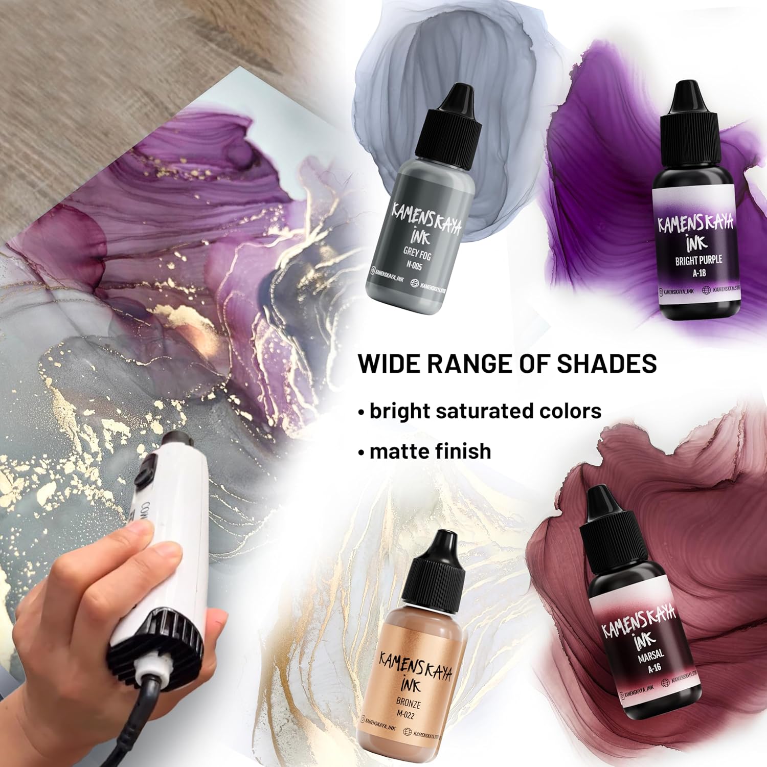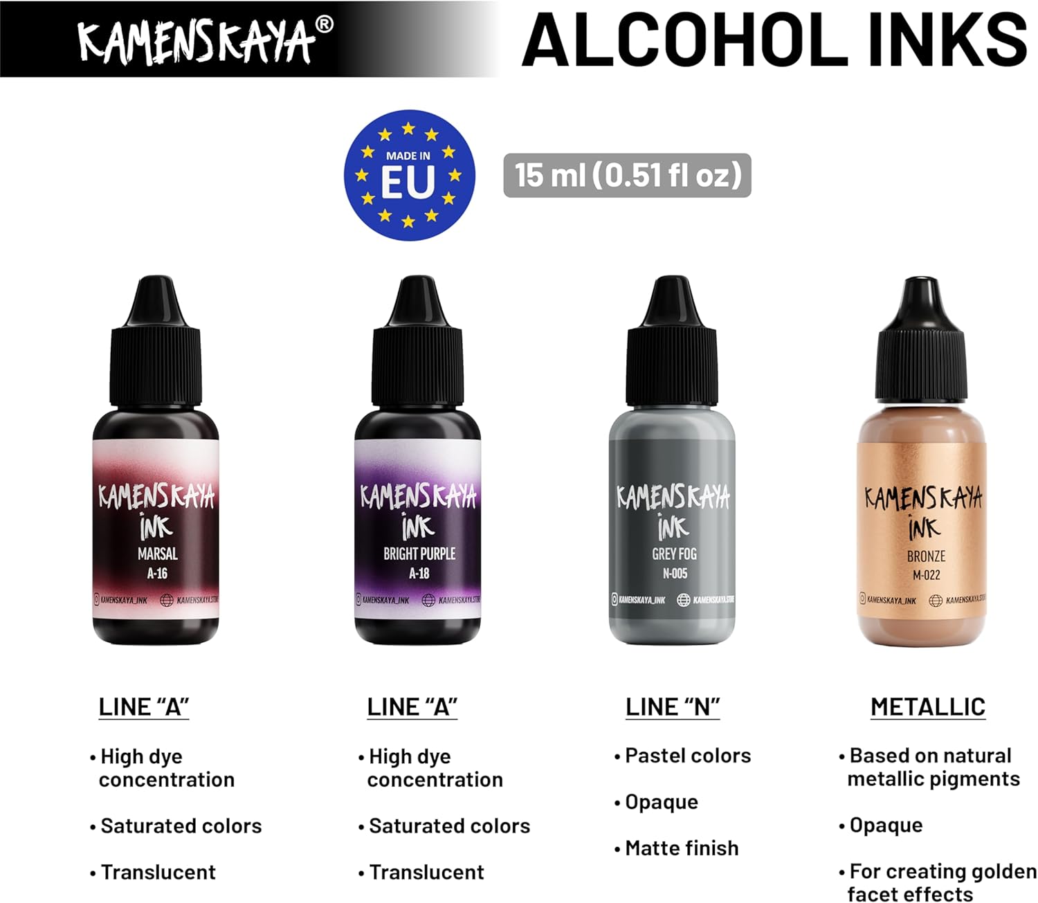 - Set composition: 4 inks 0.51 fl oz (15 ml) each. 2 inks of basic ‘A’ line (light translucent texture, saturated color and a nice satin finish), 1 metallic alcohol ink (natural metallic pigment ink to create golden facets and light cobwebs in your ink art work) and 1 pastel alcohol ink (delicate pastel shade with velvety finish based on dye and pigment, where the pigment provides a dense and opaque layer, while the dye is responsible for the color)