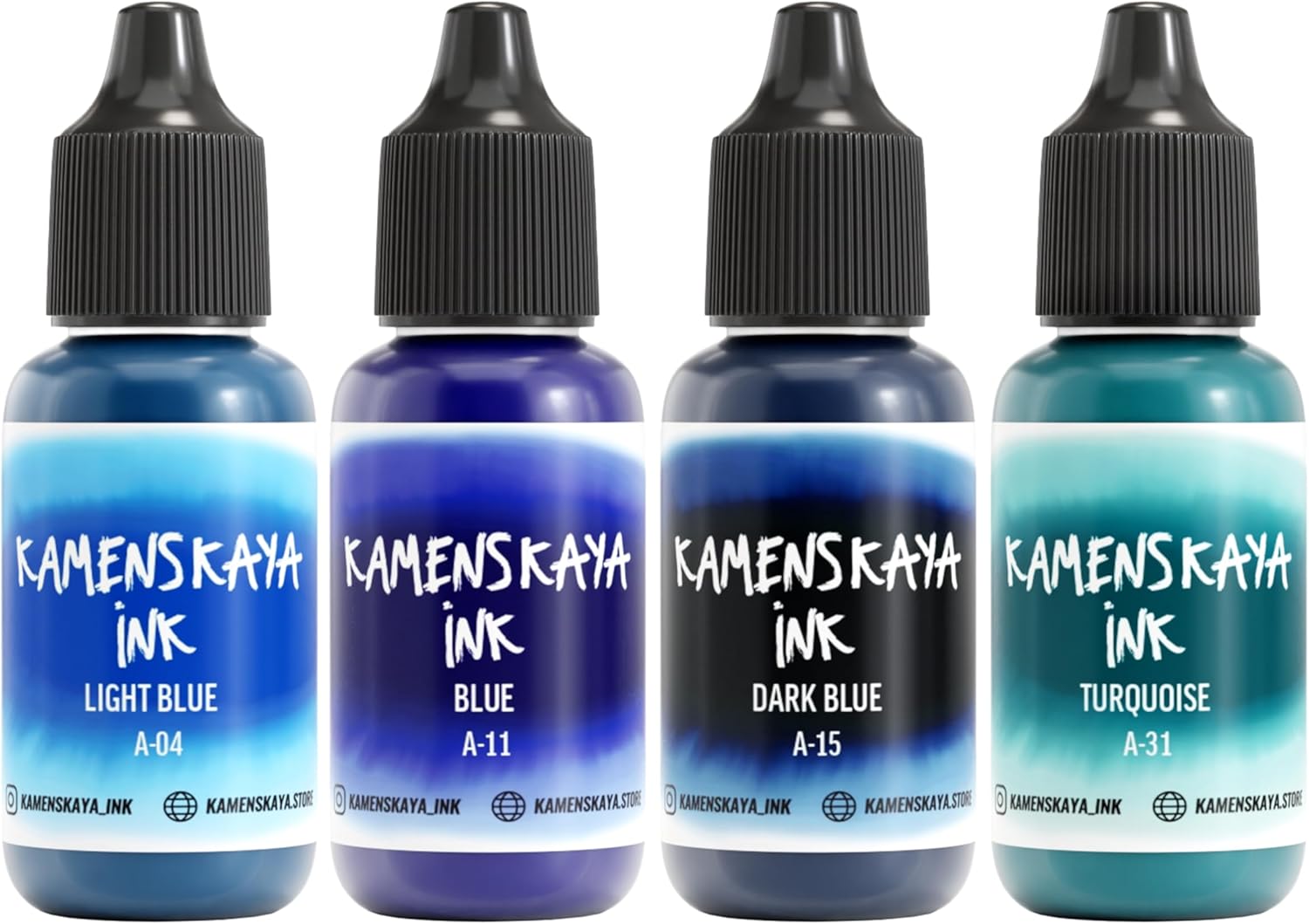 - Set composition: 4 inks 0.51 fl oz (15 ml) each of basic ‘A’ line (light translucent texture, saturated color and a nice satin finish)