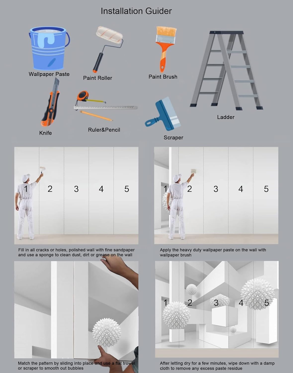- Easy Installation 1.Fill in all cracks or holes and clean dust dirt and grease on the wall surface. 2. Apply the heavy duty wallpaper paste on the wall not mural. 3. Use a spirit level to mark each strip location. 4. match the pattern by sliding into place. 5.use a scraper to smooth out bubbles press. 6. Let dry for a few minutes and that's it! Please Note: Not self-adhesive. We recommend to use a standardized fleece wallpaper paste.