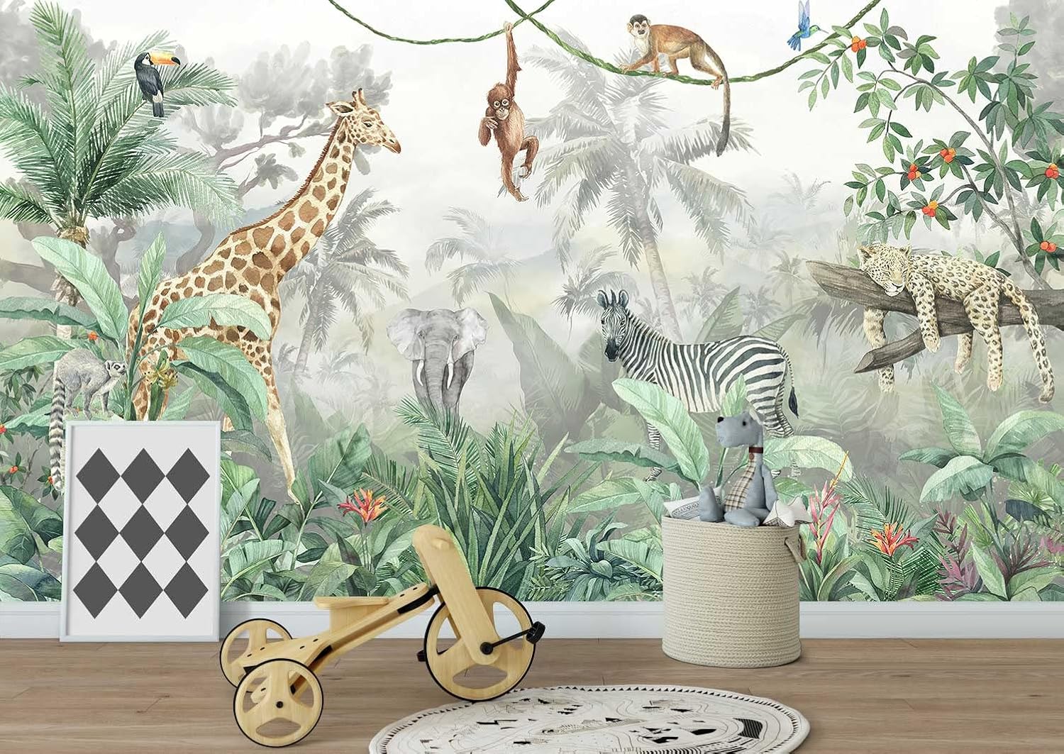 Kids Wallpaper Tropical Leves and Safari Animals Wall Mural for Wall Bedroom Living Room TV Background Sofa Wall(Not Peel and Stick)