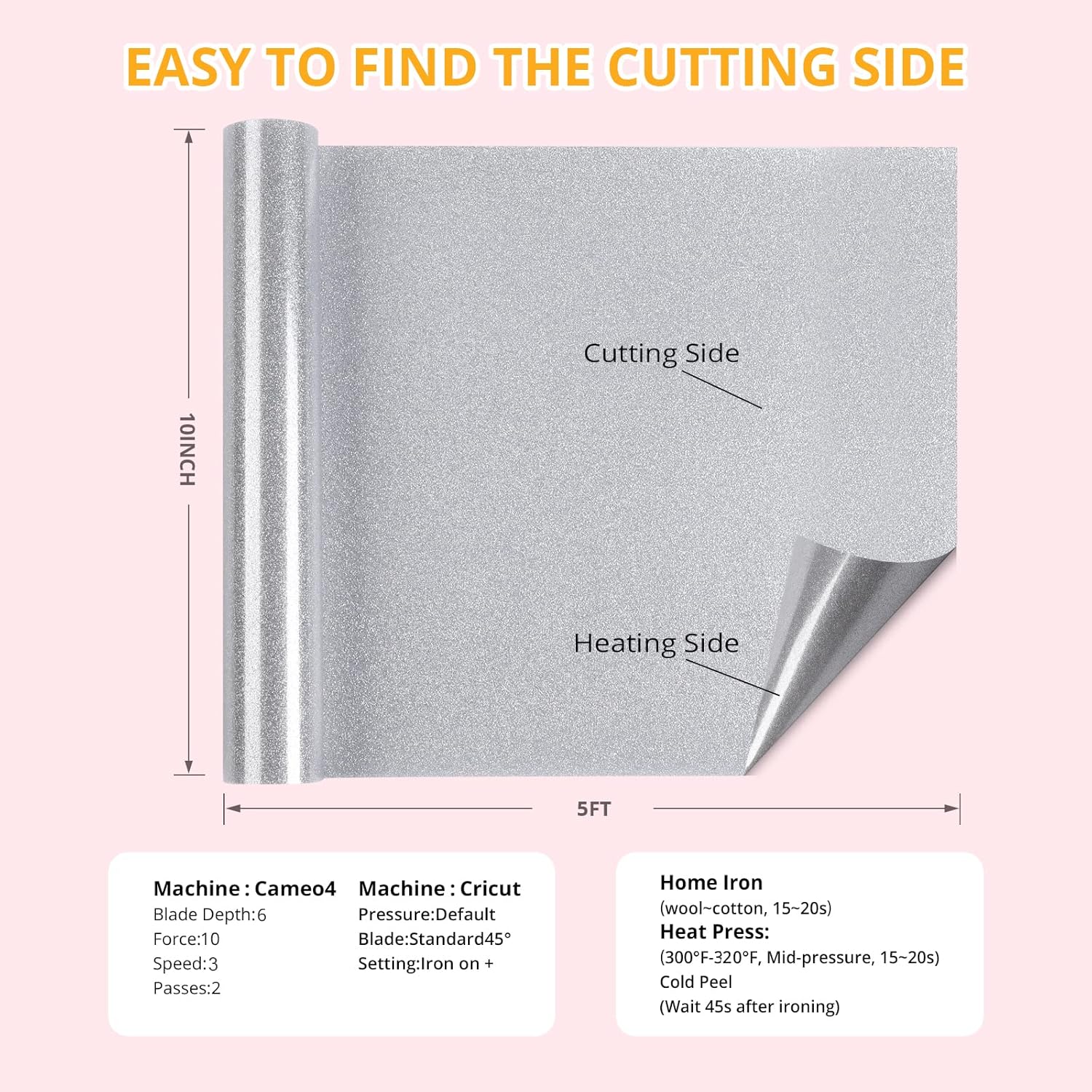- 【Sparkle & No Residue】Our silver glitter htv vinyl rolls are specially processed to give your designs a shinier look. Additionally, all of our glitters are embedded in vinyl and won't leave residues when weeding and won't fall from your project. Novices or professionals, big or small projects, this silver glitter iron on vinyl roll is a great choice for you!