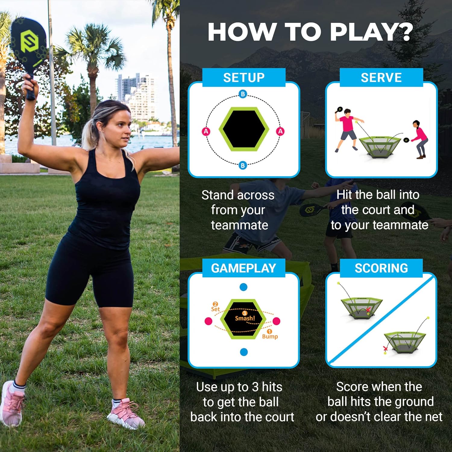 - SMASH YOUR WAY TO VICTORY: Team up and strategize to bump, set, and smash the ball over the net; A fun-filled beach game or camping game that caters to 2-4 players; Score, compete, and spike your way to victory.