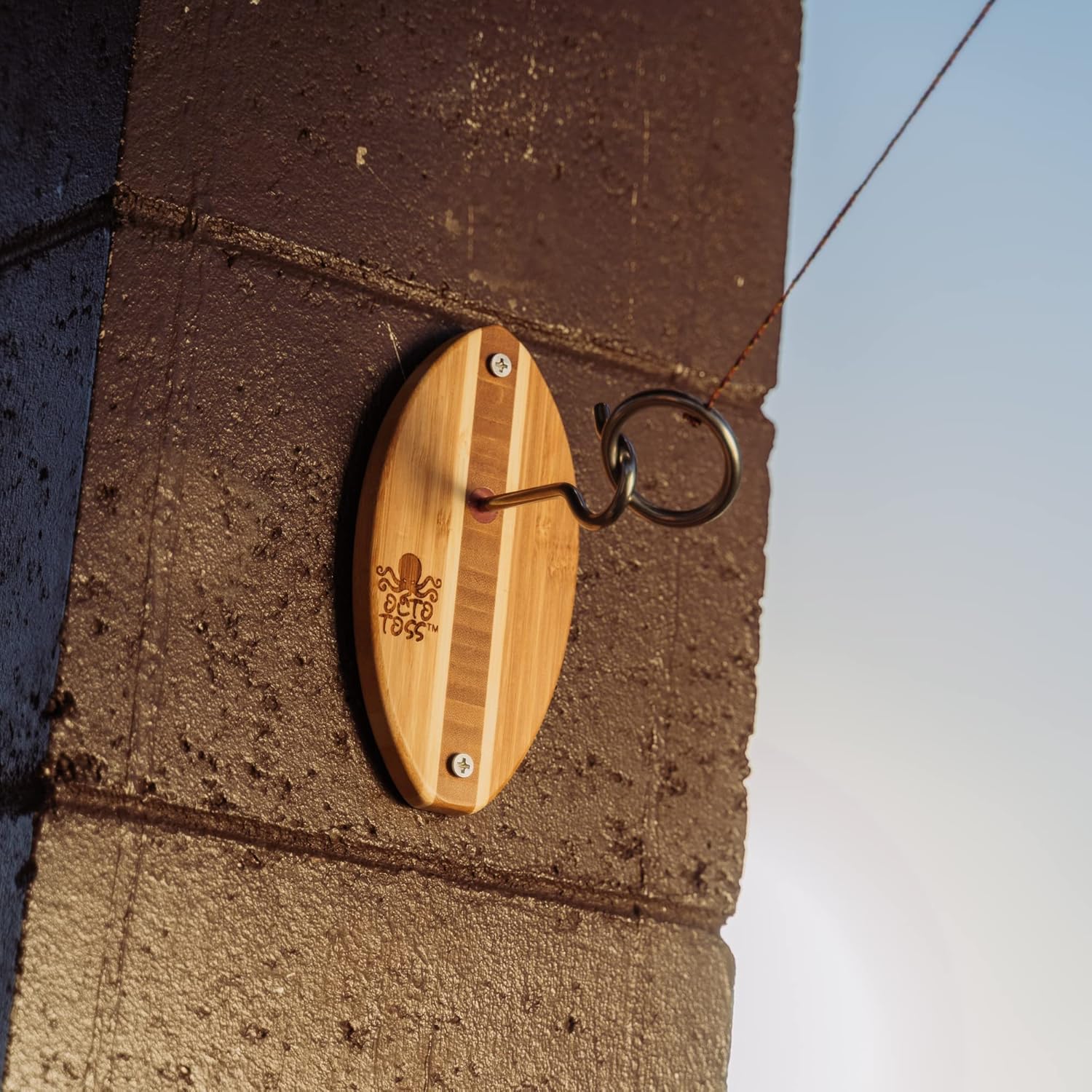 - What’s In The Set: (1) Mini Bamboo Surfboard 7x3.5” with pre-drilled wall holes, (1) Marine Grade 316 Stainless Steel OctoHook and Ring, and Extra Strong Eye Hook for Ceiling, (2) Strong Wall Screws, (3) Drywall Anchors, (1) Cord Lock and (1) 8Ft Paracord. (1) Guide for set up and play included. It’s easy to fix to your wall and ceiling!