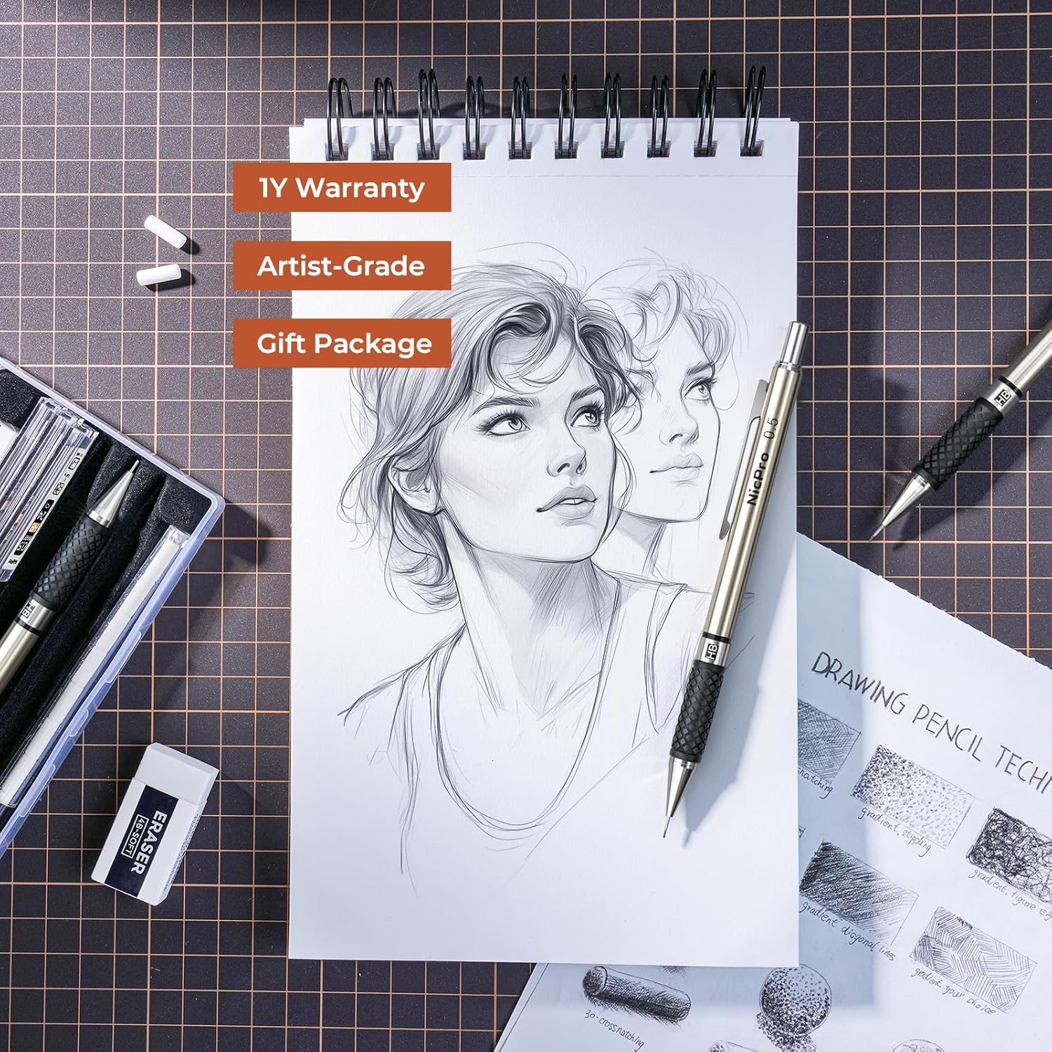 - Value Mechanical Pencils Set: Nicpro RG1000 series drafting pencil set come with 3 pcs metal mechanical pencils 0.5, 6 tubes HB lead refill (24 pcs / tube), 3 pcs erasers, 9 pcs eraser refills, a plastic pencil case, easy to carry and storage