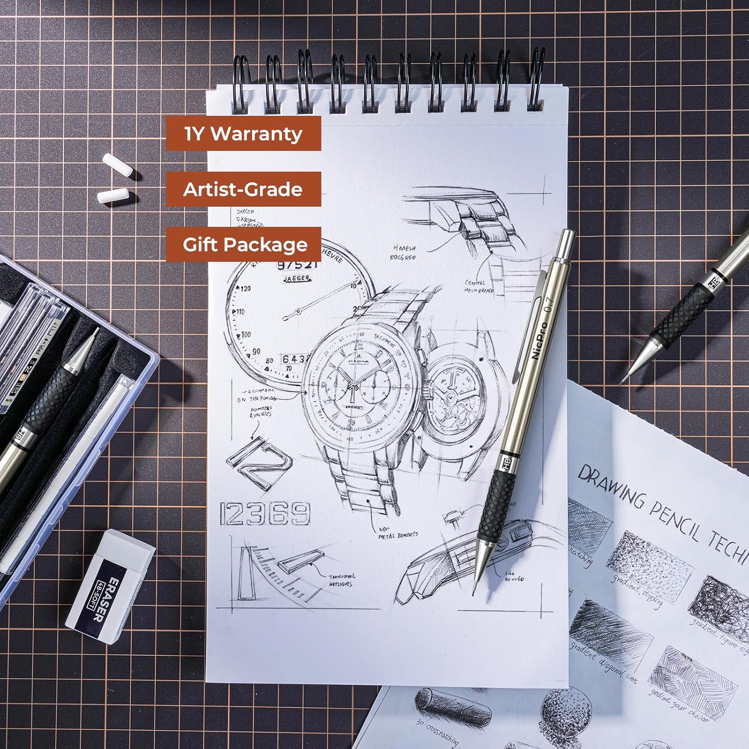 Nicpro 0.7 mm Art Mechanical Pencil Set in Storage Case, 3 PCS Metal Drafting Pencil Lead Pencil with 6 Tube HB Lead Refills, 3 Erasers, 9 PCS Eraser Refills for Artist Writing, Drawing, Sketching
