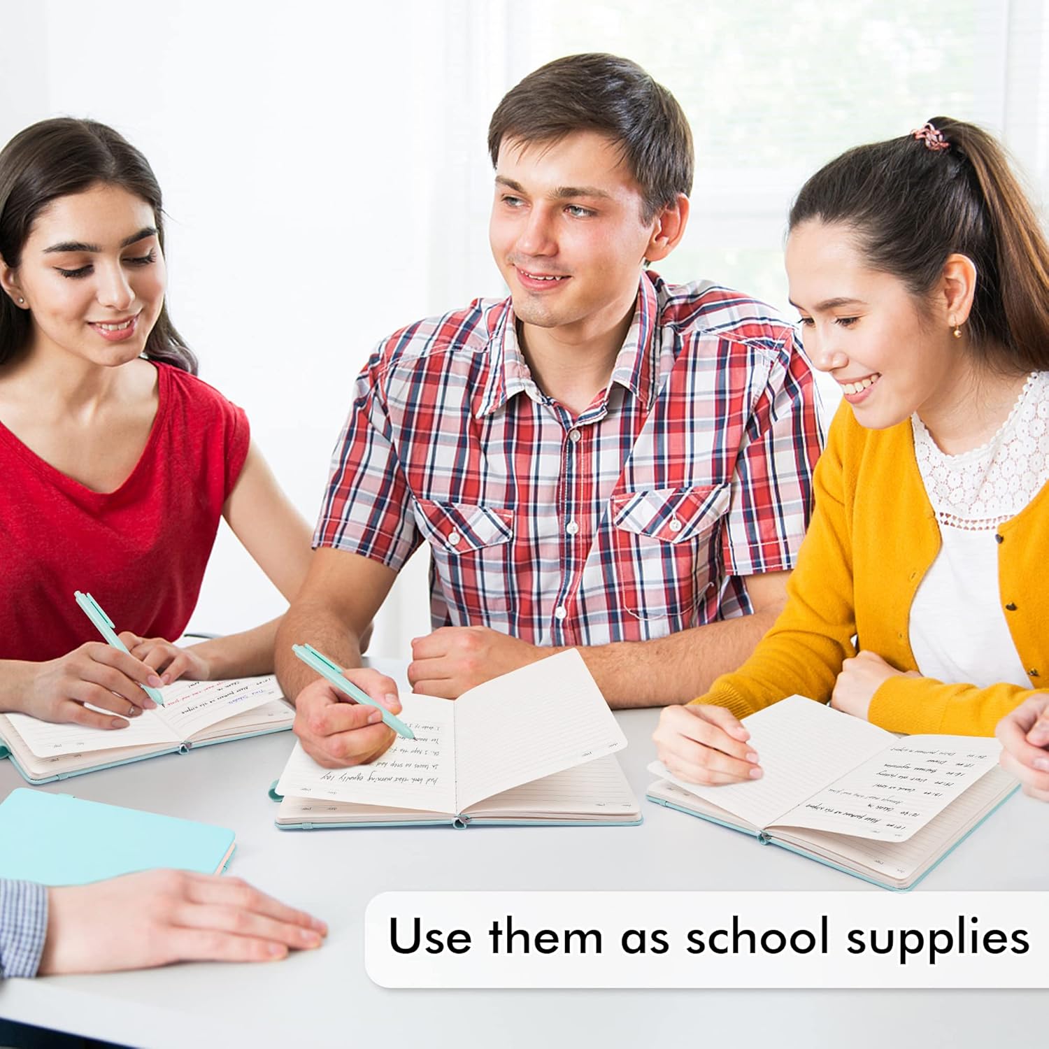 • Feela 5 Pack Classic Ruled Notebooks contains 5 sky blue ruled sturdy cover notebooks and 5 Black Retractable Pens. Each of the notebooks measures 8.3” x 5.1”, which is perfect to carry and easily held by young girls and boys. These black cute pens are customized to be placed in the pen holder, which is pretty convenient.