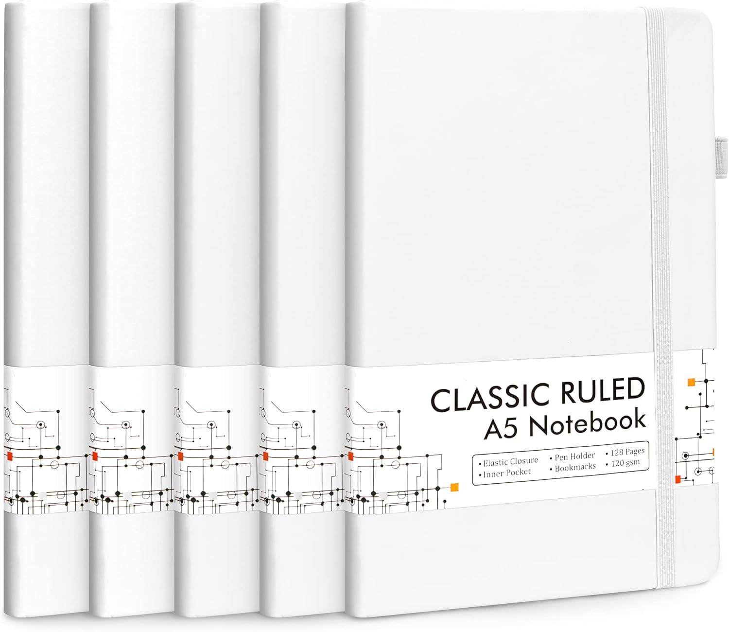 feela 5 Pack Notebooks Journals Bulk, Hardcover Notebook Classic Ruled Lined Journals with Pen Holder for Women Girls School Business Supplies, with 5 Black Pens, 120 GSM, 5.1”x8.3”, A5, White