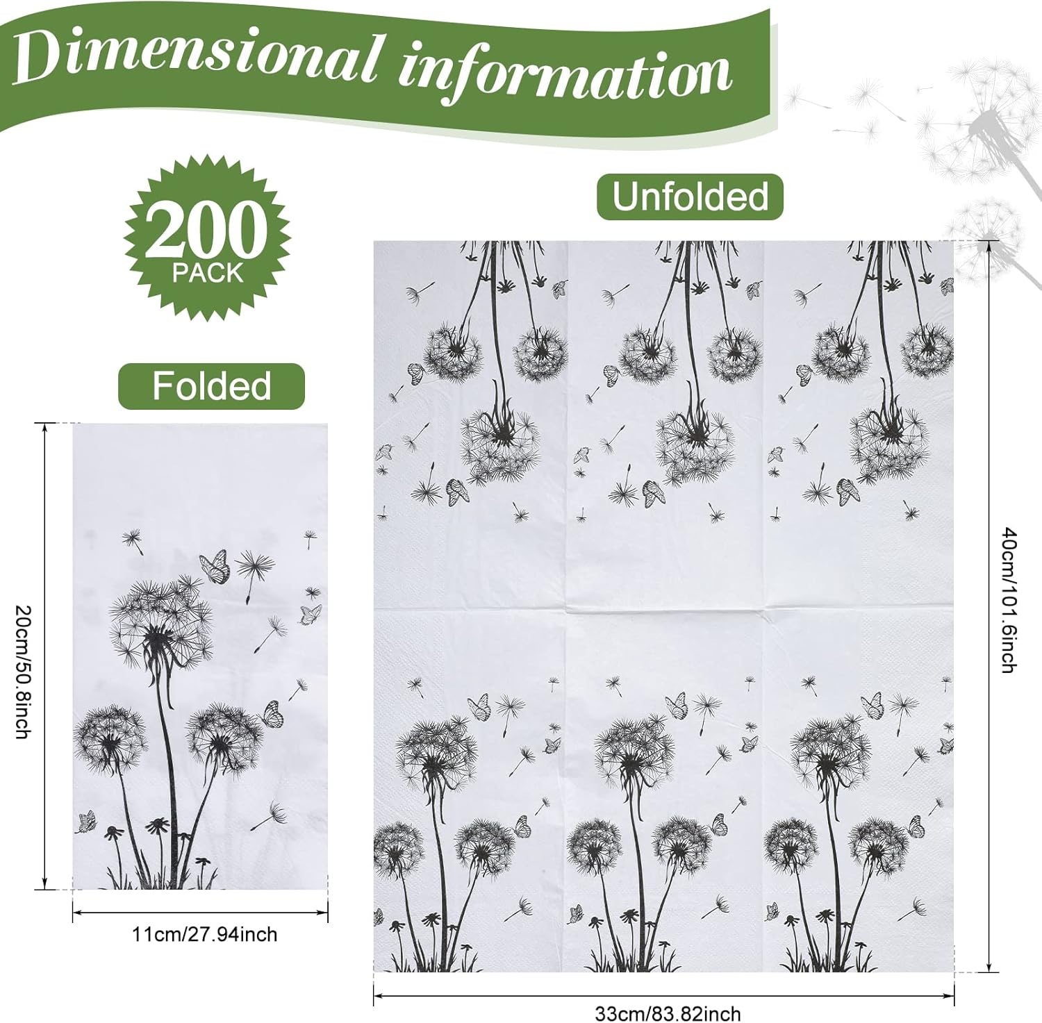 - Proper Size Design: each sheet of the bathroom decor dandelion paper towels measure approx. 7.9 x 4.3 inches when folded, the unfolded size is about 12.99 x 15.75 inches; This right size is suitable for many kinds of parties and situations, which will be your choice