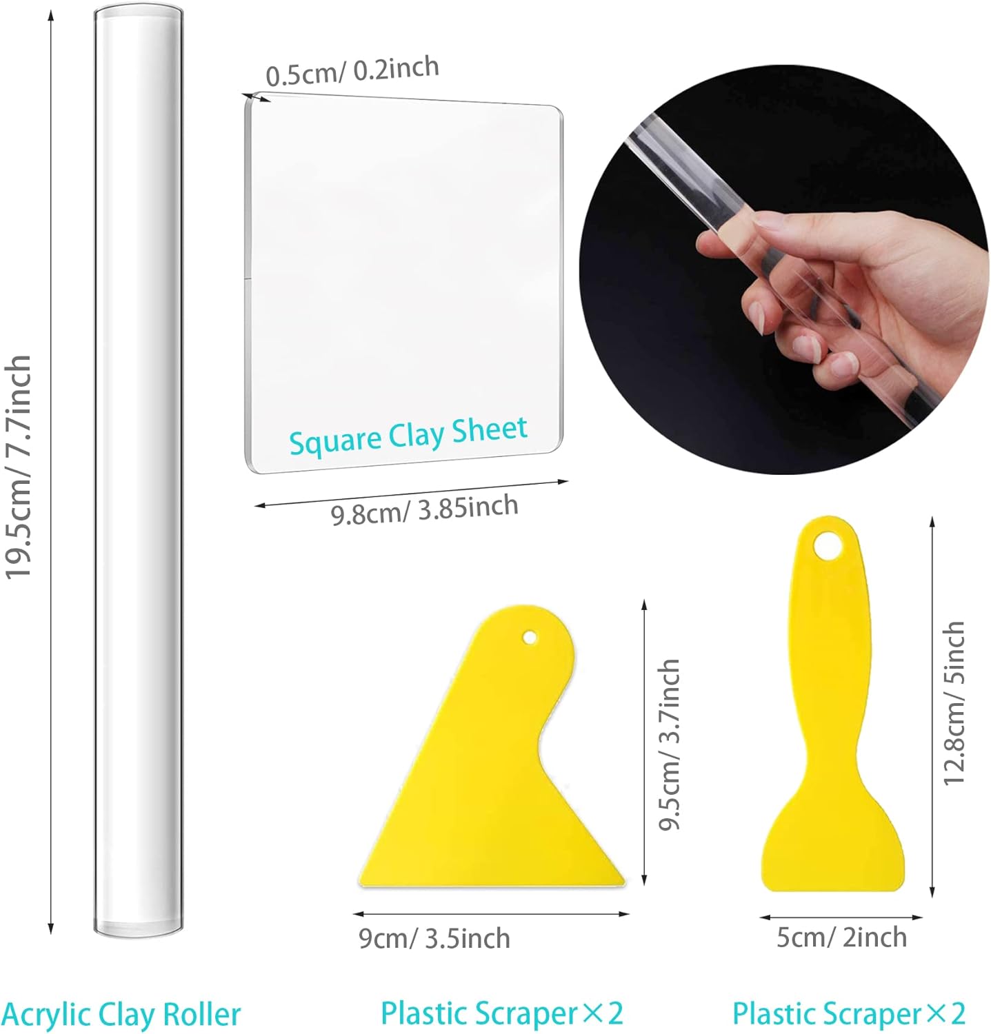 - 35 PCS Polymer Clay Cutting Set: 5 x clay slicer blade, 8 x round clay cutters of different sizes, 14 x plastic crafts clay modeling tool, 4 x scraper, 1 x acrylic clay roller, 1 x acrylic sheet, 2 x clay needle tools.