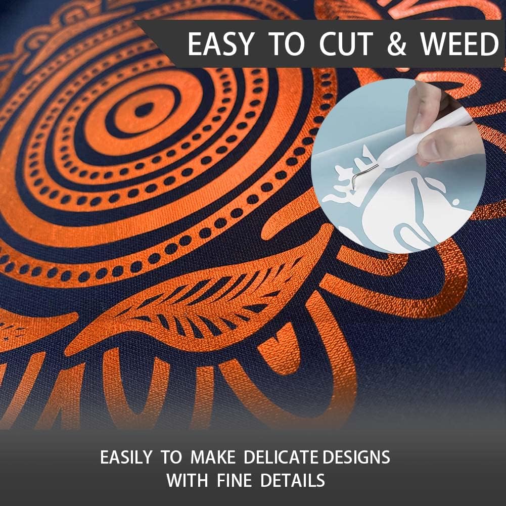 - Easy to cut and weed, great stickness, compatible with all vinyl cutters. Orange foil htv rolls packing are easy and convenient to cut into different size of art designs or logos or letters and perfect for 12" x 12" and 12" x 24" cutting mats.