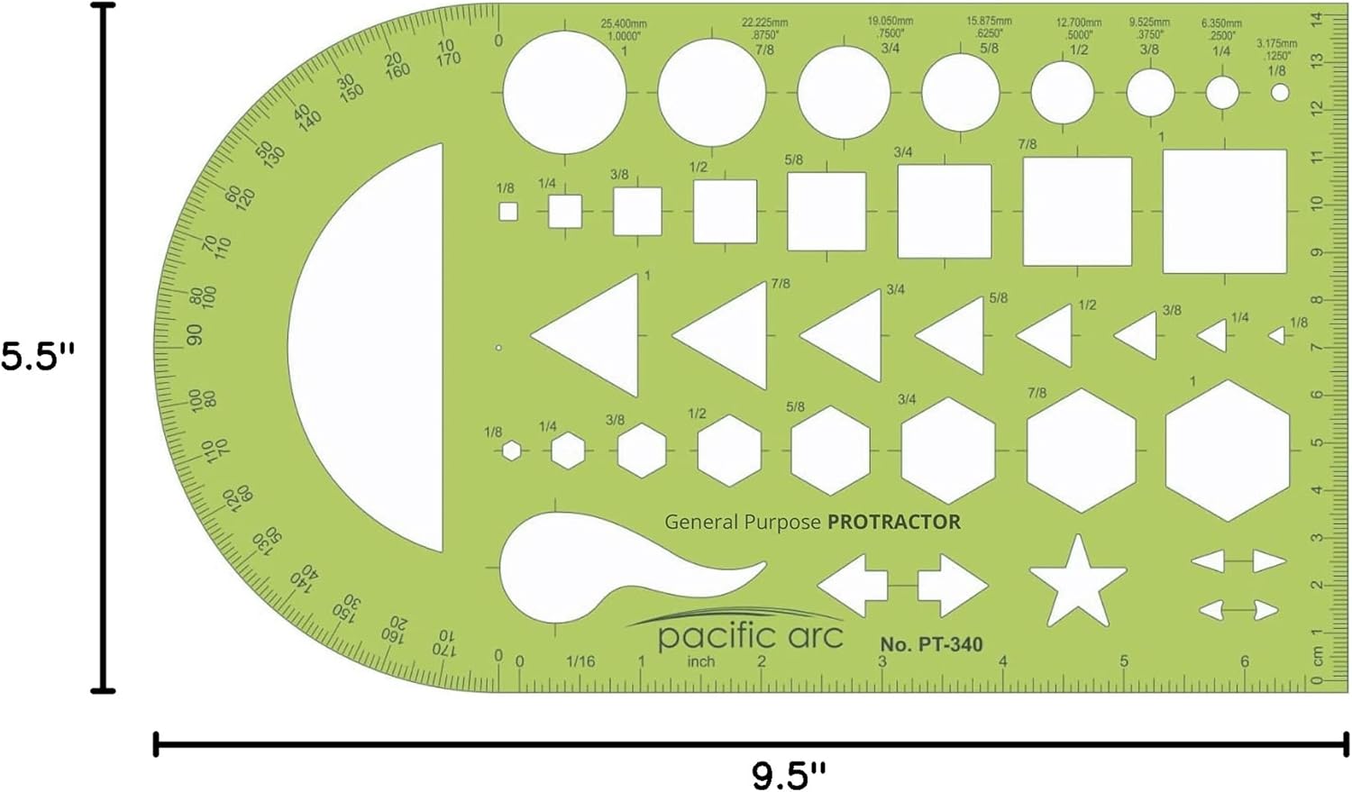 Pacific Arc - General Purpose Template with Protractor - Drawing Aid Stencil for Professional or School Work - Size 5.5" x 9.5"