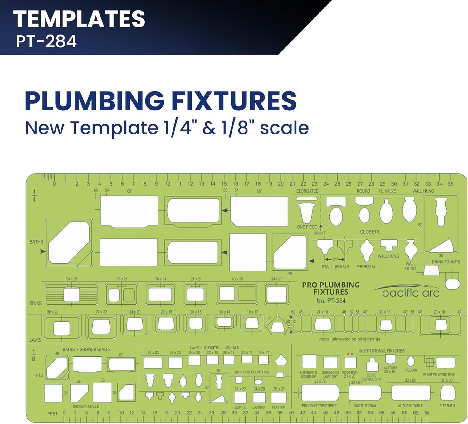 Pacific Arc, Plumbing Fixtures Template, 1/4 & 1/8 Scale. Drawing aid Stencil for Professional or School Work. Size 3.5 x 6 inch.