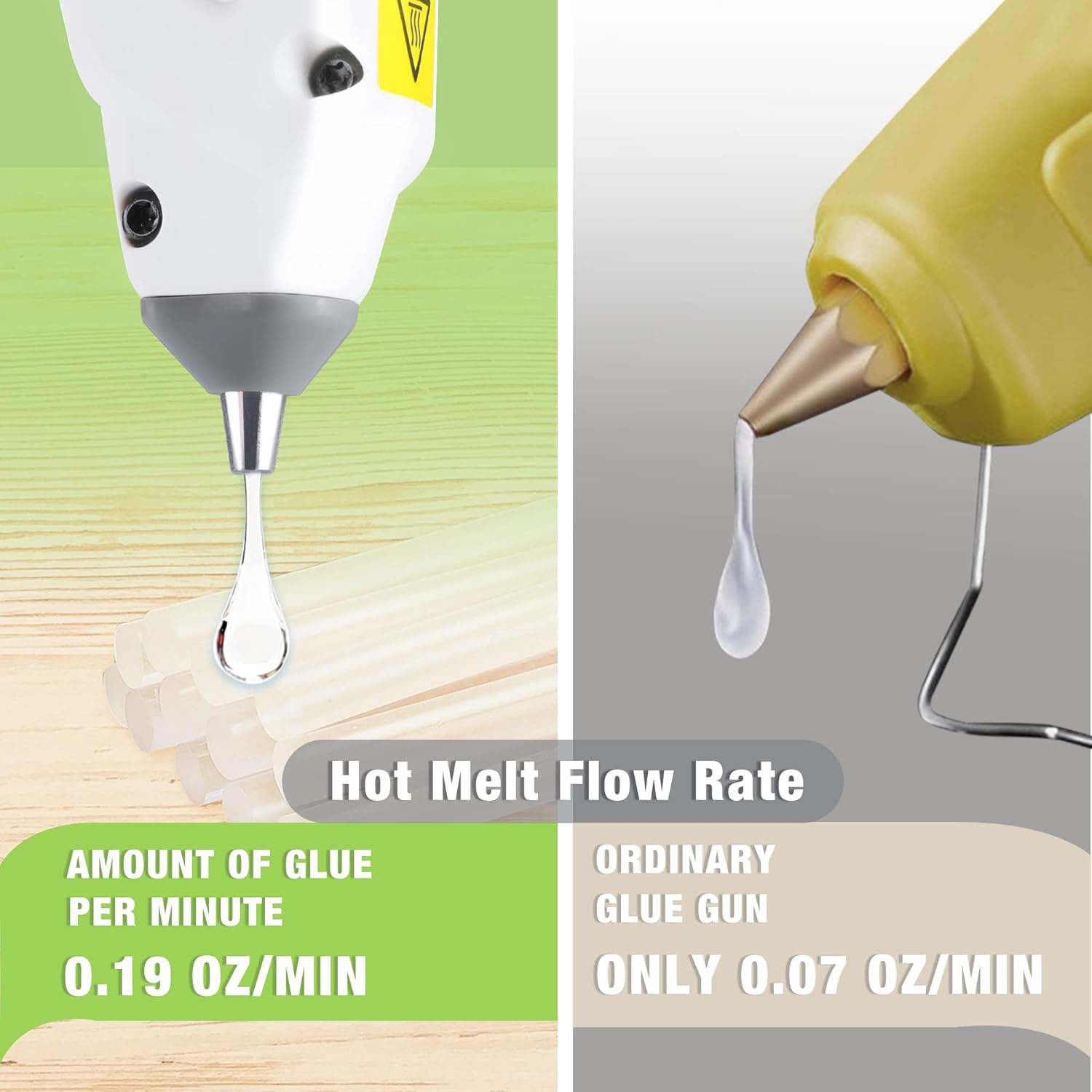- Fast Glue Output: This wireless hot glue gun has a very fast glue output speed, dispensing 0.18oz/5g per minute, much faster than the 0.07oz/2g per minute of ordinary hot glue guns. The glue gun cordless also features a low-leakage nozzle design, effectively reducing glue spillage, saving more glue sticks, and keeping your work area clean. Additionally, the battery operated glue gun comes with a vertical stand that can be placed on a stable surface, making it convenient to use at any time.