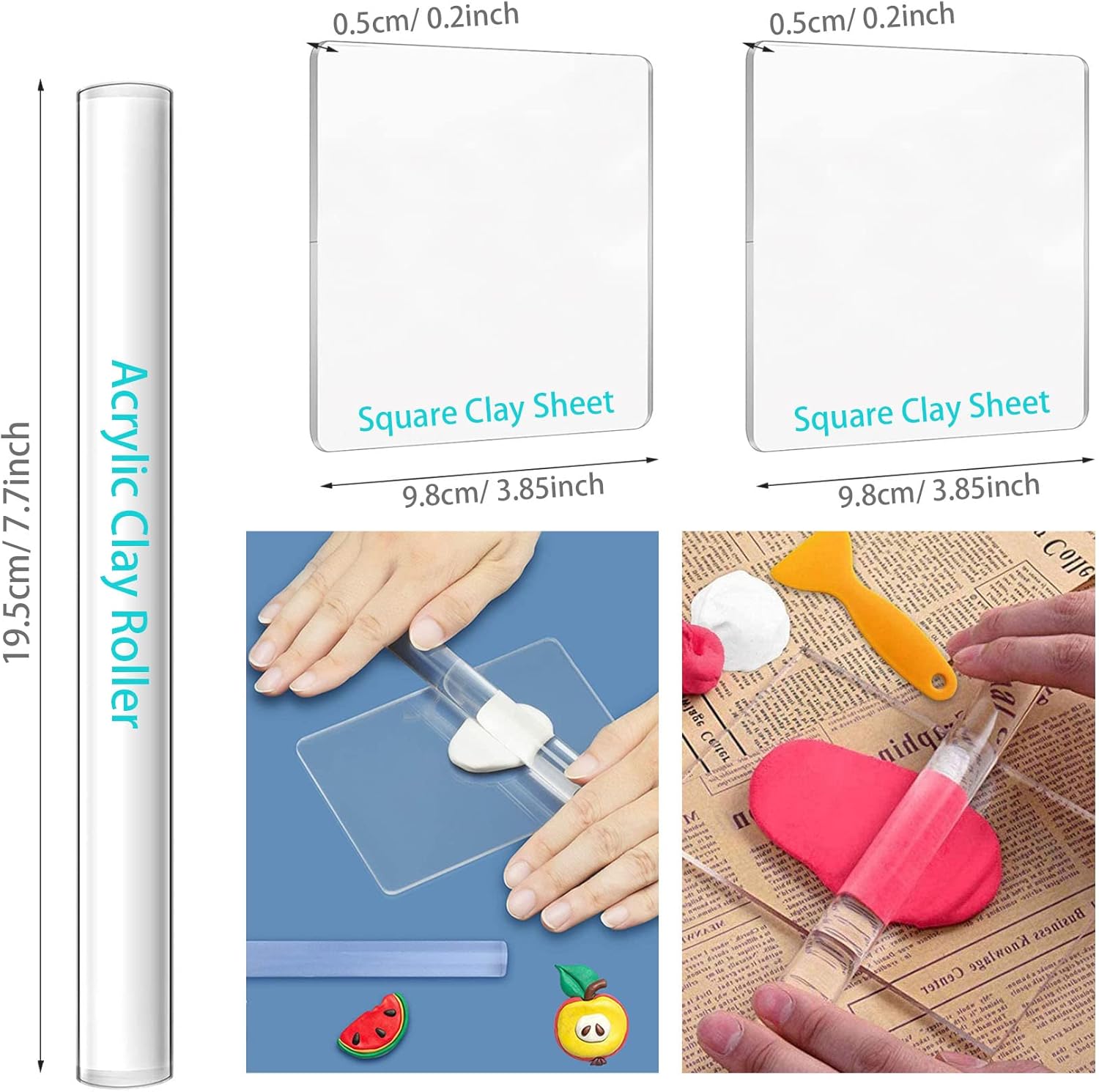 - Acrylic sheet and acrylic clay roller: Clear acrylic sheet, measures 10 x 10 cm/ 3.94 x 3.94 inch, acrylic sheet can be used for backing board or pressing clay into other shapes as your like, combined with the rolling pin to do them well.