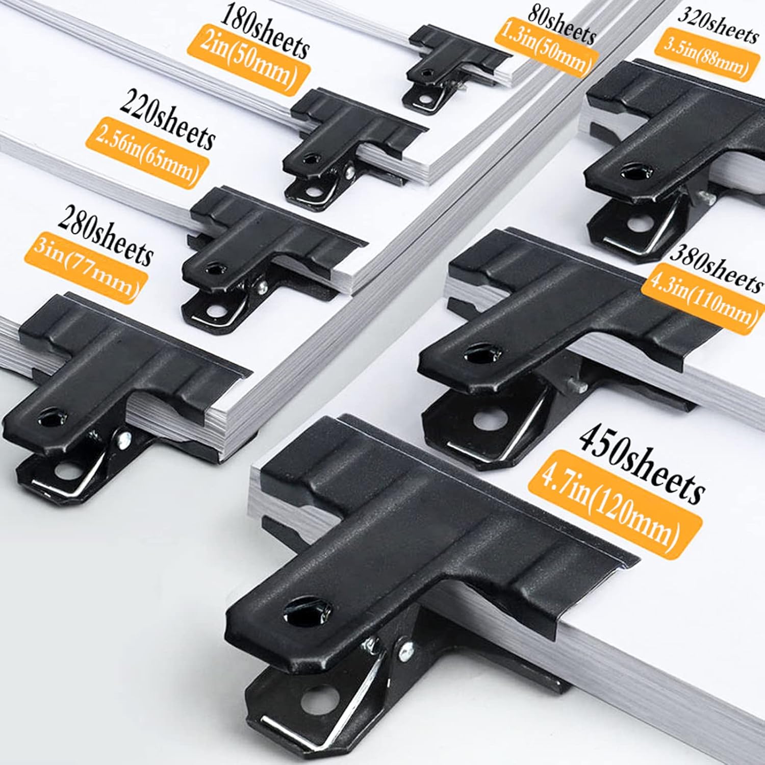 - 【Large Binder Clips】This bulldog clip has a width of 3.5 inches and a maximum opening of 1.6 inches. It can easily clamp 320 sheets of paper, with a thickness of about 1.3 inches (3.33cm).