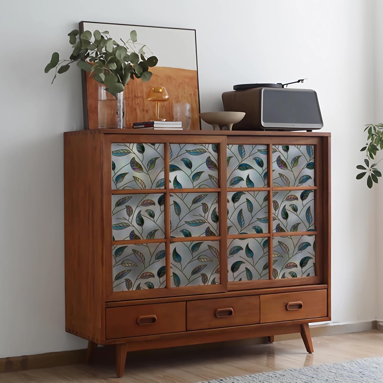 DKTIE Static Cling Decorative Window Film Vinyl Non Adhesive Privacy Film with Installation Kit, Multilayer UV Inkjet Technology, 3D Thickened Stained Film, Vintage Leaf Pattern, 17.7 x 78.7 Inches