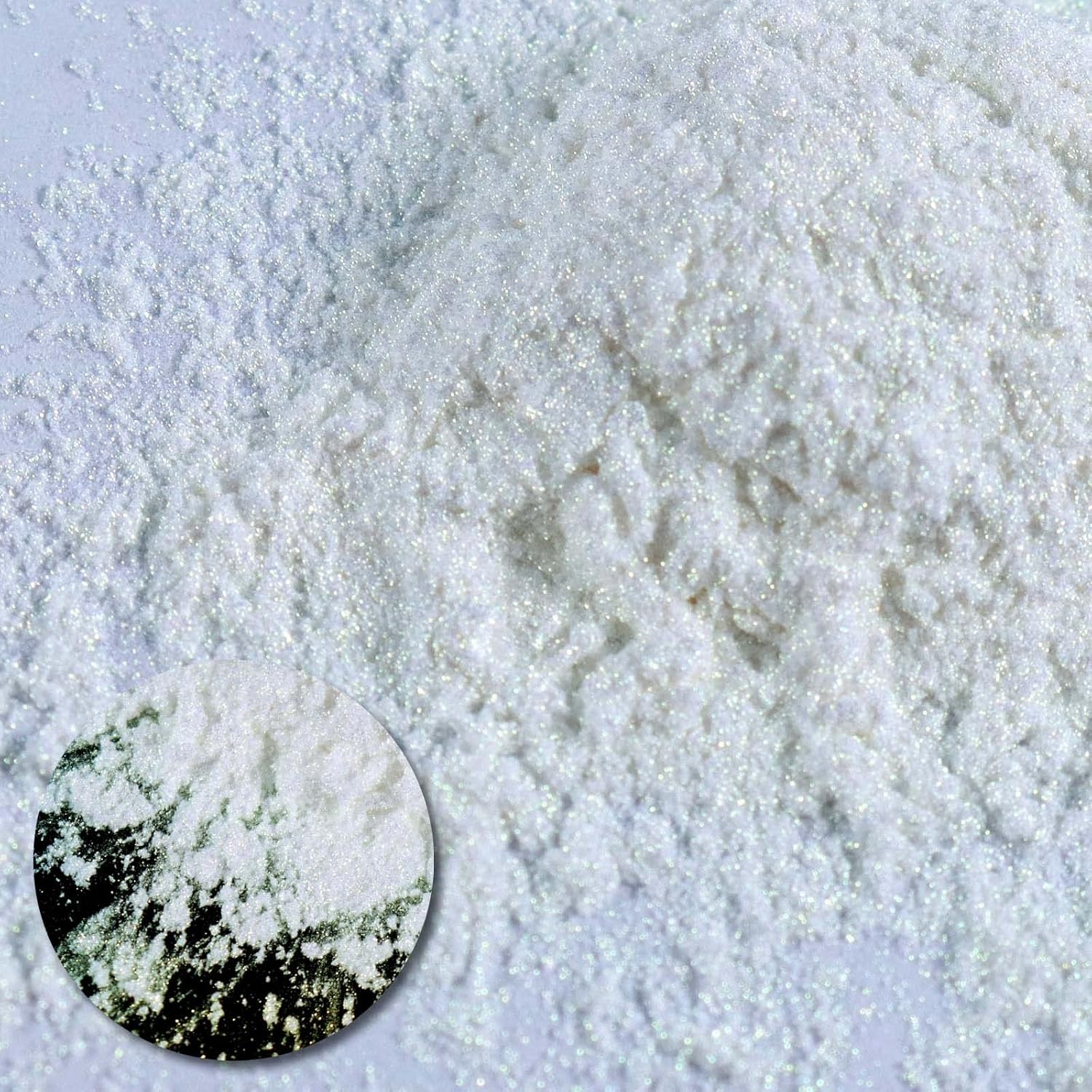 - ✨ Chameleon Mica Powder: Appearance is white mica powder defined by light refraction, reflection, and transmission to show color. A sparkly white color pigment that has Blue-Green-Gold hues when mixed into clear epoxy resin. These micas will elevate your resin projects in a subtle color shift all while remaining pearlescent.