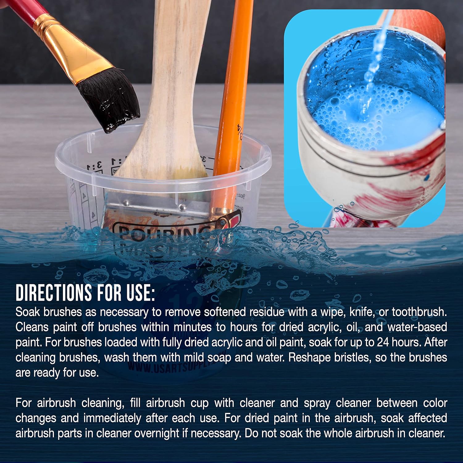 - High-Strength Multi-Purpose Cleaner: Penetrates and cleans water-based paint, acrylics, gouache, watercolors, inks, dyes, makeup, tanning solution, and cake decorating colors from airbrushes.