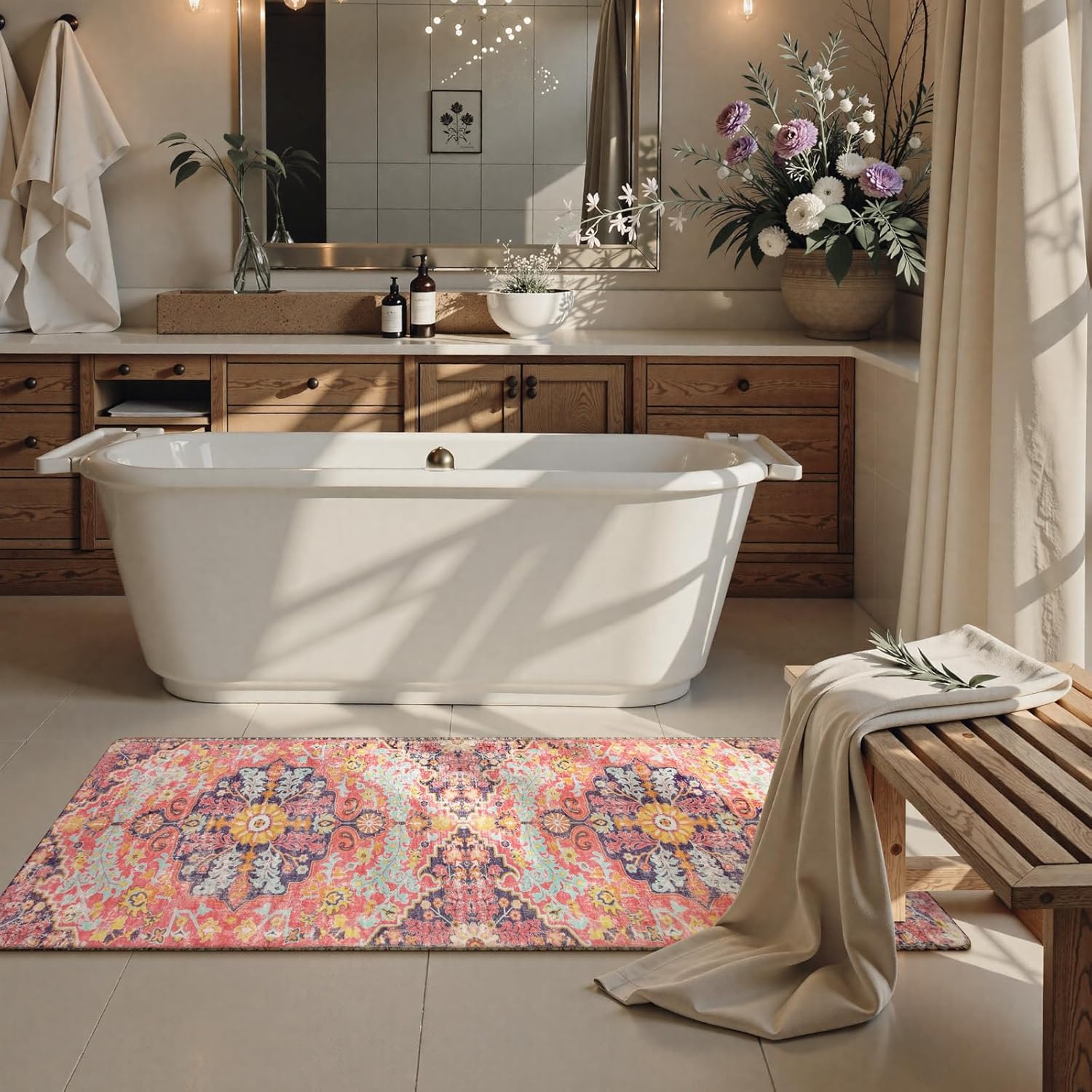 Lahome Bohemian Washable 2x5 Hot Pink Kitchen Runner Rug, Non Slip Bathroom Laundry Room Rug Runner, Floral Medallion Soft Carpet Runners for Entryway Hallway Foyer Decor
