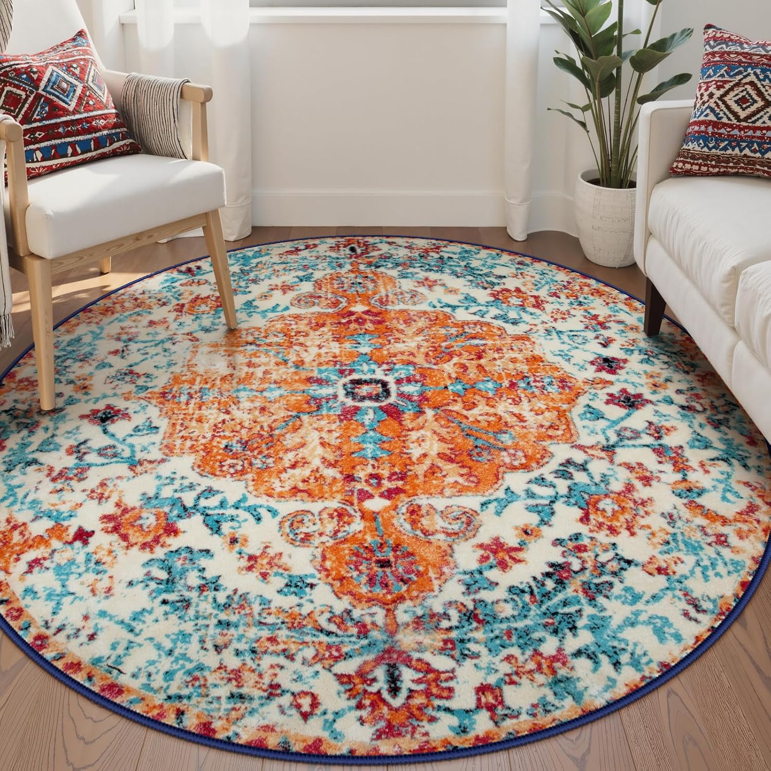 Lahome Bohemian Floral Medallion Round Rug - 6Ft Soft Rug for Living Room Washable Rug for Dining Room, Vintage Faux Wool Non Slip Cute Table Throw Carpet for Coffee Table Nursery Guest Room