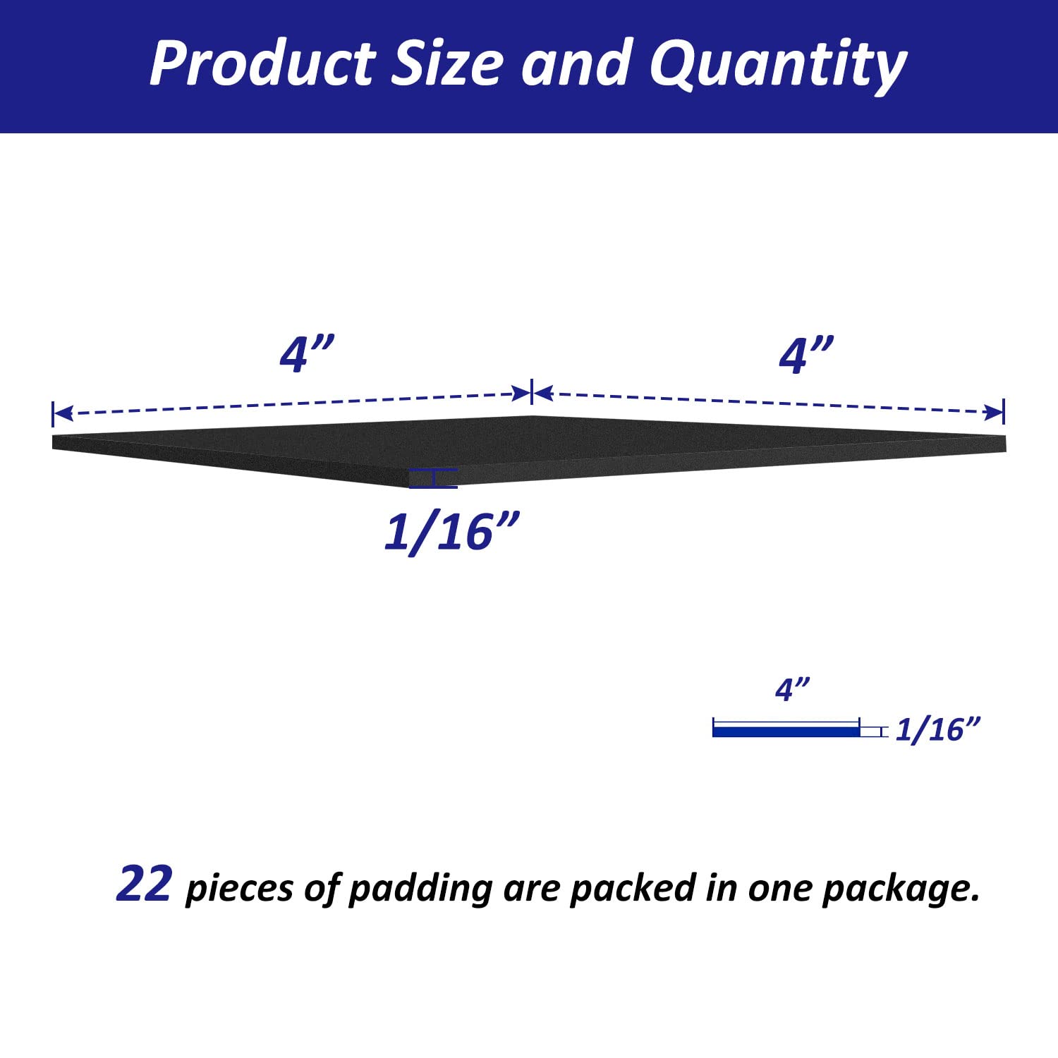 - Foam Padding Sheet Size: 1/16 inch Thick x 4 inch L x 4 inch W x 22 Pieces. You can cut the anti-slip foam padding into any size and shape you need by using a blade.
