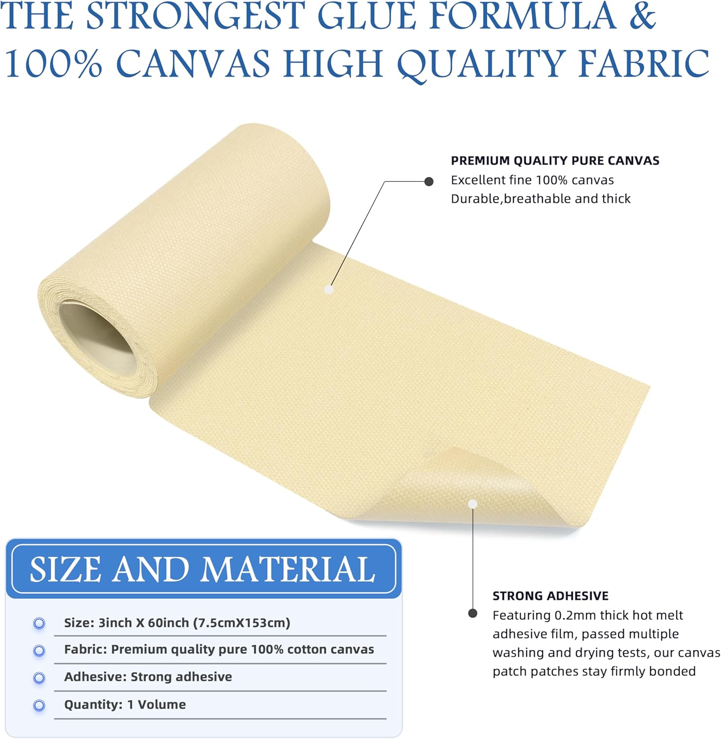 - Premium quality material: 3"x60"(7.5x152cm), large enough to help you repair holes of different sizes, one roll is more convenient for you to store and use. The front of this canvas iron on patches patch is made of 100% cotton canvas, which is tight and thick, wear-resistant and durable, and can be used on the inside and outside of clothes. The back features a 0.3mm thick strong hot-melt adhesive film, which can help you repair various damage problems quickly and easily.