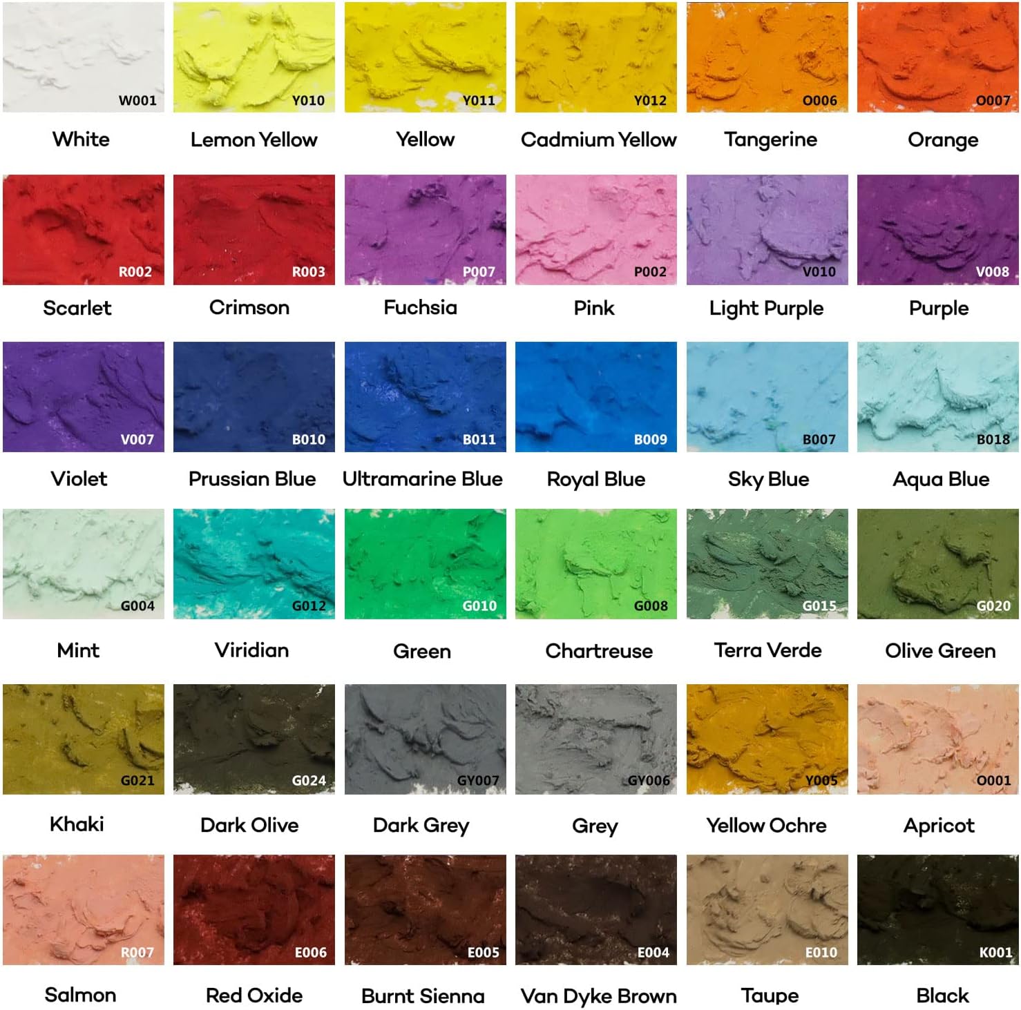 - Includes 39 vibrant oil pastels: White (x 4), Lemon Yellow, Yellow, Cadmium Yellow, Tangerine, Orange, Scarlet, Crimson, Fuchsia, Pink, Light Purple, Purple, Violet, Prussian Blue, Ultramarine Blue, Royal Blue, Sky Blue, Aqua Blue, Mint, Viridian, Green, Chartreuse, Terra Verde, Olive Green, Khaki, Dark Olive, Dark Grey, Grey, Yellow Ochre, Apricot, Salmon, Red Oxide, Burnt Sienna, Van Dyke Brown, Taupe, Black