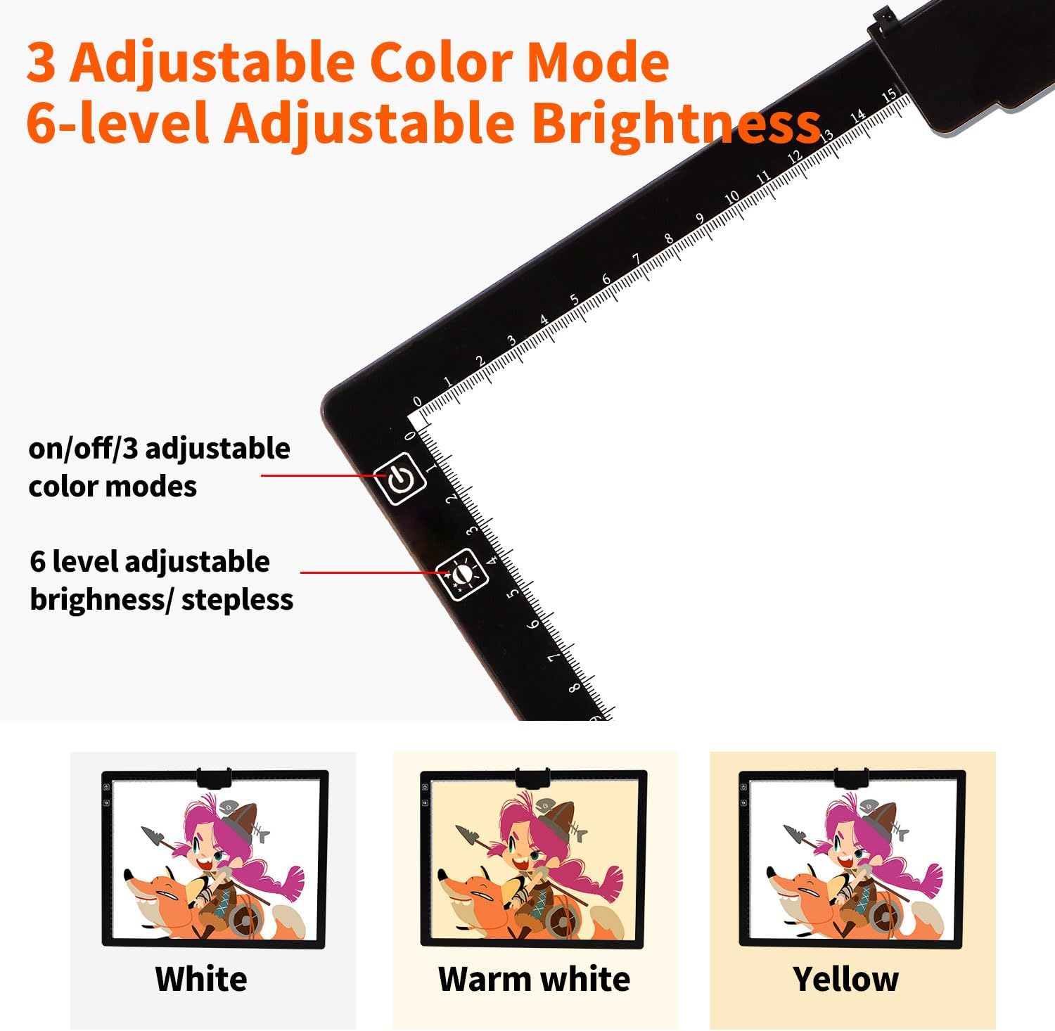 - β[Multi-function]--The light board has 3 light colors (white, warm yellow or warm white) to choose from and 6 levels of brightness or (10% β 100%) stepless brightness can be adjusted, allows you to choose the right light color and brightness for your eyes in different environments.