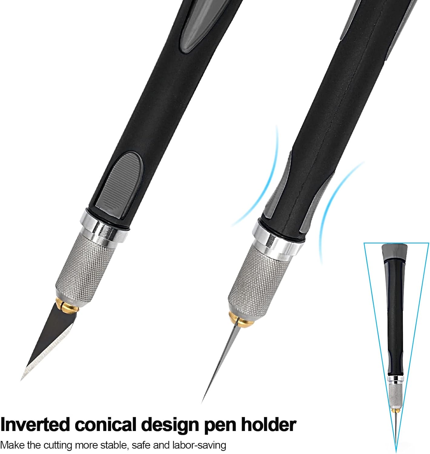 - Ergonomic Design Razor Knife: The heavy-duty knife handle is made of soft rubber and ABS plastic with a thick base for added grip & stability and an irregular shaped tail so it is not easy to roll off your desk. The pen shaped handle weighted for balance with both textured grip and anti-slip grip on a lower middle place, superior control allows you to make accurate, delicate cuts.