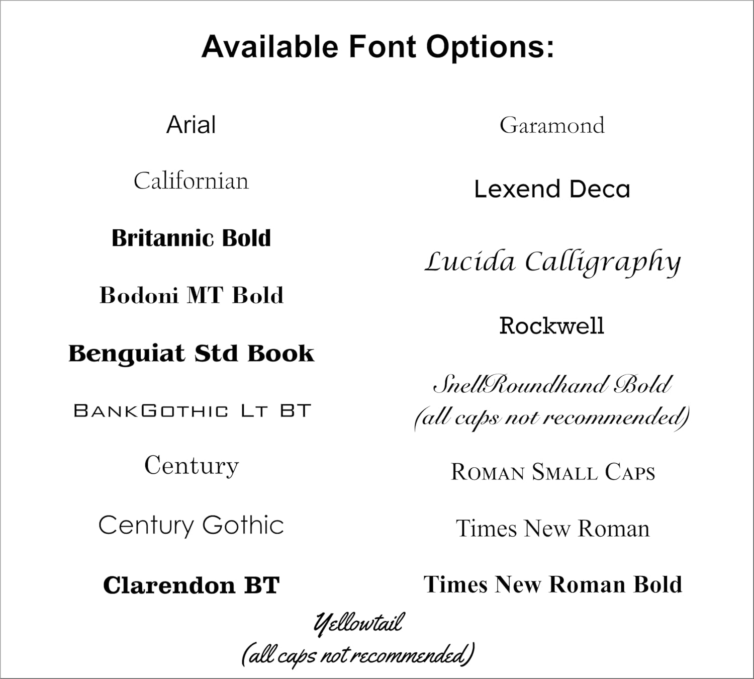 - All text will be centered. If you only need two lines of text, use lines 1 and 2 and we will center all text.